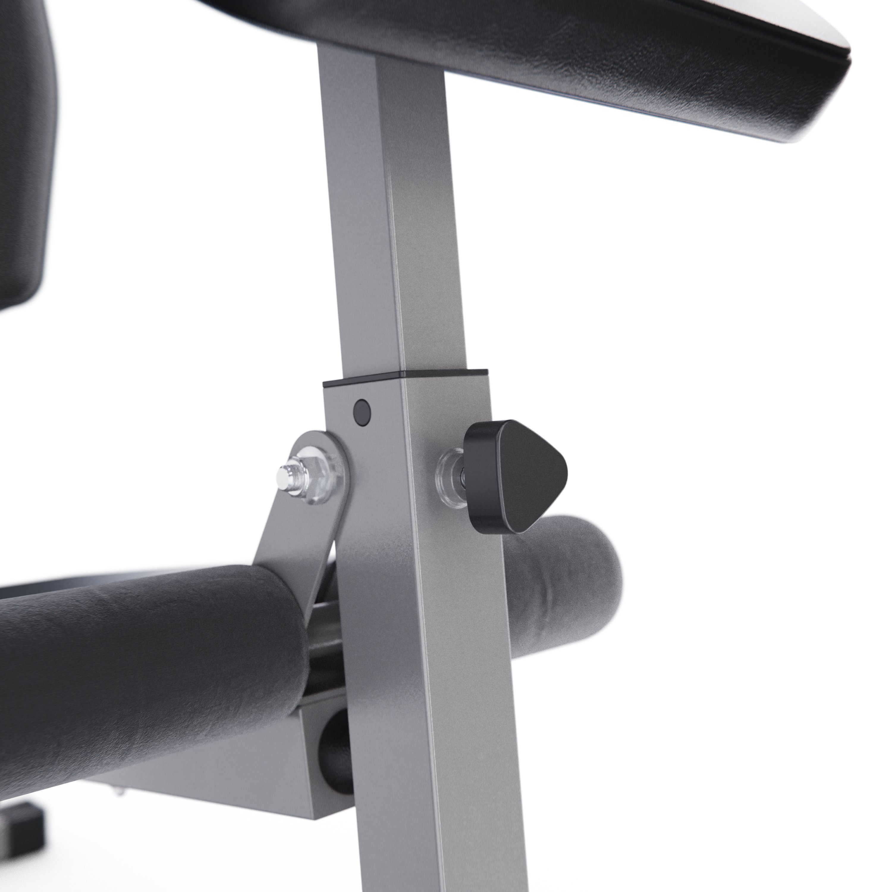 Сиденье и спинка с плотной обивкой чёрного цвета с красными вставками зафиксированы для комфортного выполнения упражнений. Парта для бицепса из той же ткани регулируется по высоте. Максимальный вес пользователя — 120 килограмм.