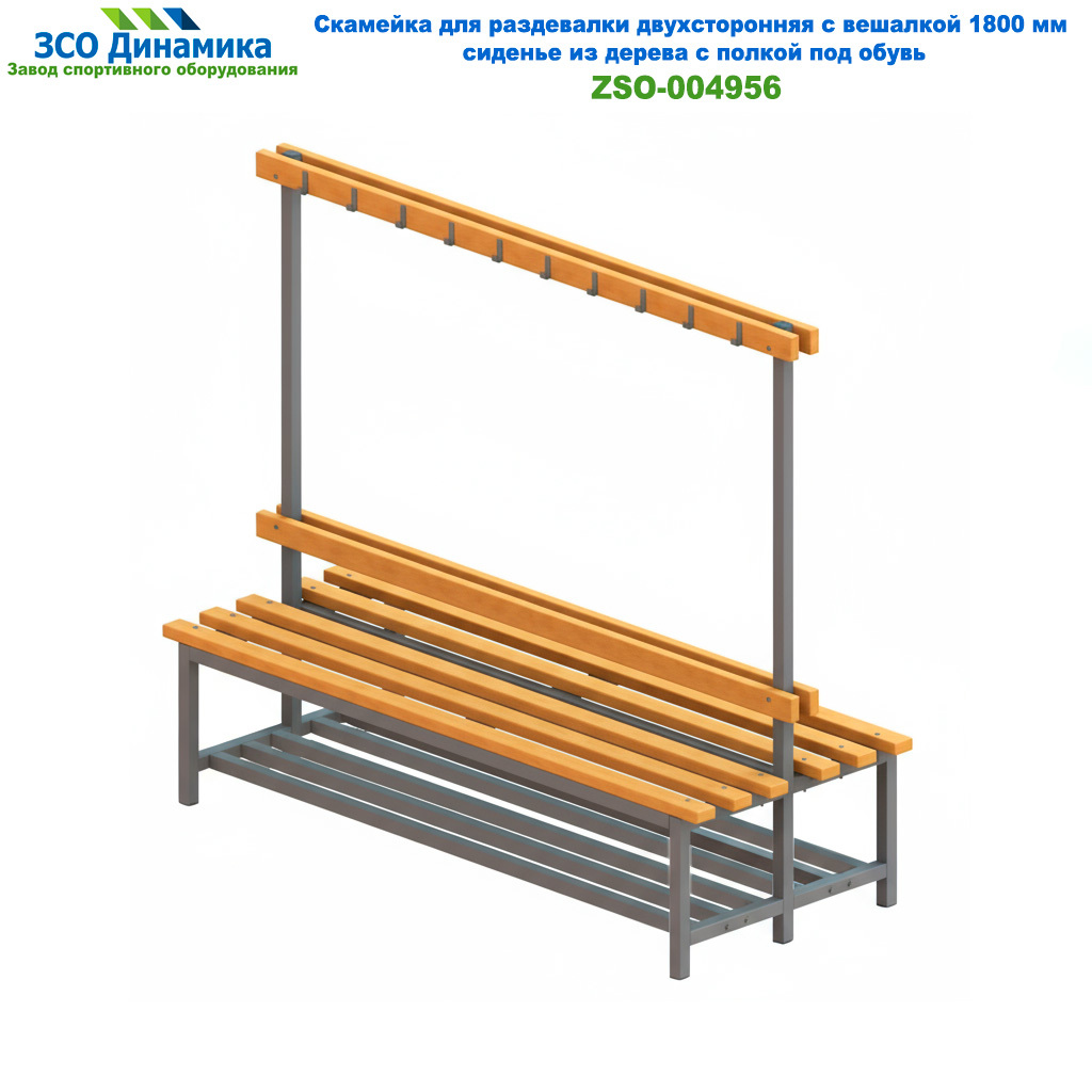 Скамейка двухсторонняя для раздевалки с вешалкой представляет собой сборную конструкцию, состоящую из 6-х планок сидения, 2 планки под спинку и 2 планки под вешалку (пиломатериал из сосны толщиной 35 мм) и каркаса из профиля стальной трубы 40х40. Поверхность планок сидения покрыта трехкомпонентным лаком в два слоя. Планки скамейки устойчивы к истиранию, царапинам и влажности. Сварные швы каркаса данного изделия тщательно зачищены. Поверхность боковин покрыта порошковой краской. Крепление планок осуществляется к каркасу скамейки при помощи мебельных болтов. Во все внешние отверстия каркаса скамейки установлены пластиковые заглушки.