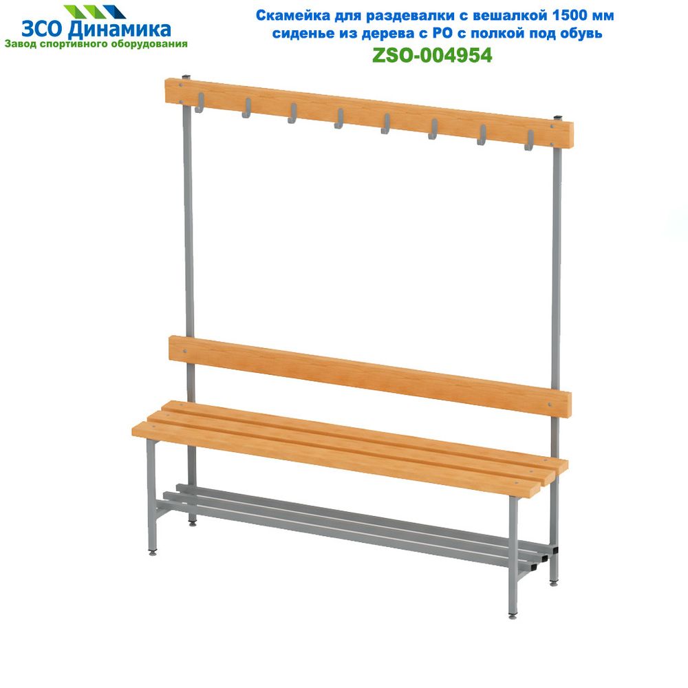 Скамейка для раздевалки с вешалкой представляет собой сборную конструкцию, состоящую из 3-х планок сидения, 1 планки под спинку и 1 планки под вешалку из массива сосны толщиной 35 мм и 2-х боковин и рамы под обувь из стального профиля. Поверхность планок сидения покрыта трехкомпонентным лаком в два слоя. Планки скамейки устойчивы к истиранию, царапинам и влажности. Сварные швы боковин данного изделия тщательно зачищены. Поверхность боковин покрыта порошковой краской. Крепление планок осуществляется к боковинам скамейки при помощи мебельных болтов. Во все внешние отверстия каркаса скамейки установлены пластиковые заглушки.