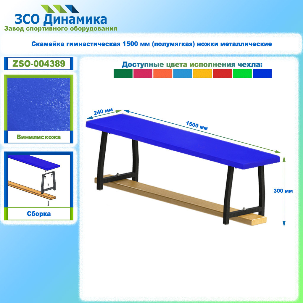 Скамейка гимнастическая (полумягкая) ножки метал - представляет собой сборную конструкцию, состоящую из мягкого сидения и царги, и металлических ножек из стальной профильной трубы, покрытых порошковой краской. Фаски по периметру царги скамейки имеют закругленную форму, что снижает вероятность получения травм при использовании изделия на занятиях. Поверхность царги тщательно отшлифована и покрыта высококачественным трёхкомпонентным лаком в два слоя. Поставляется в разобранном виде.