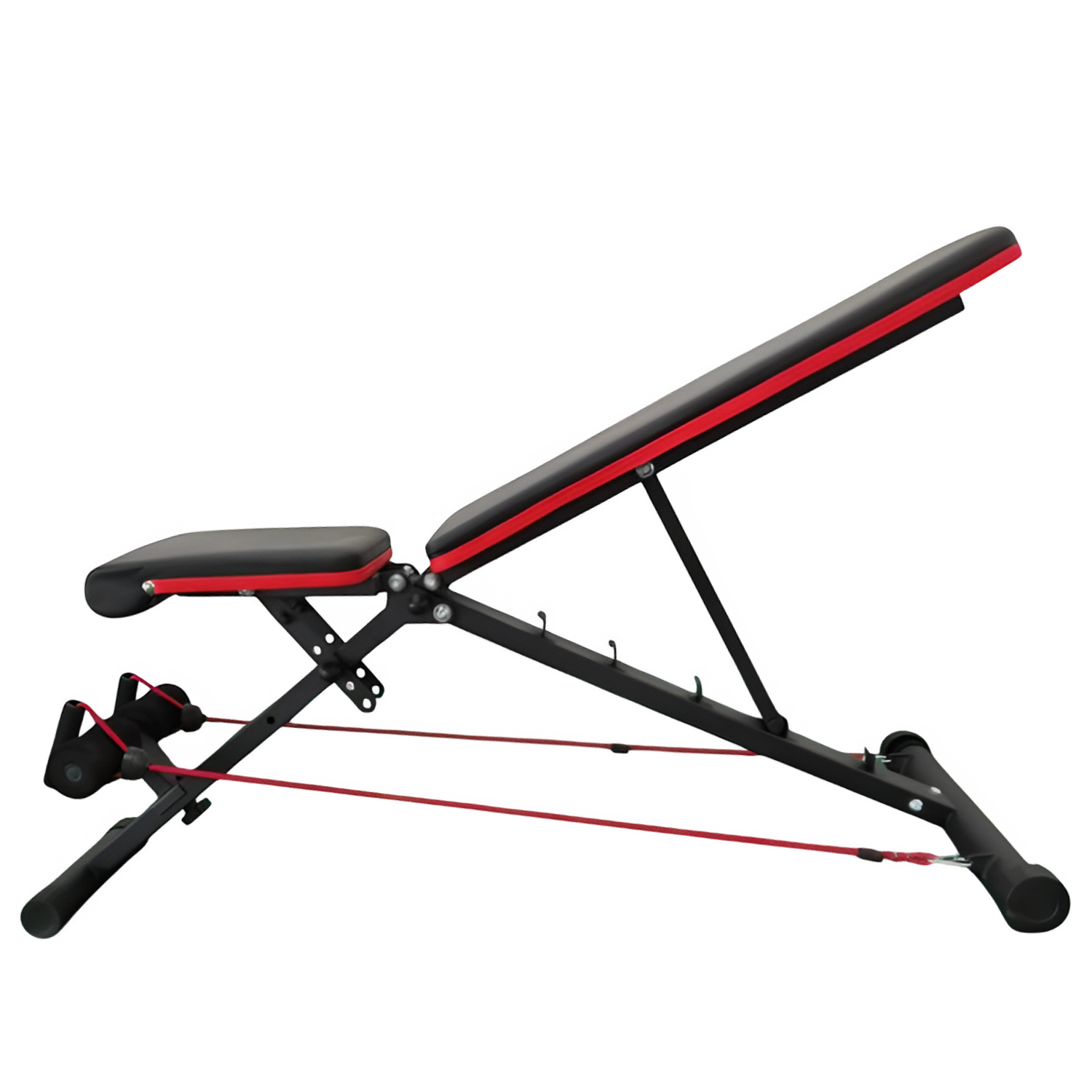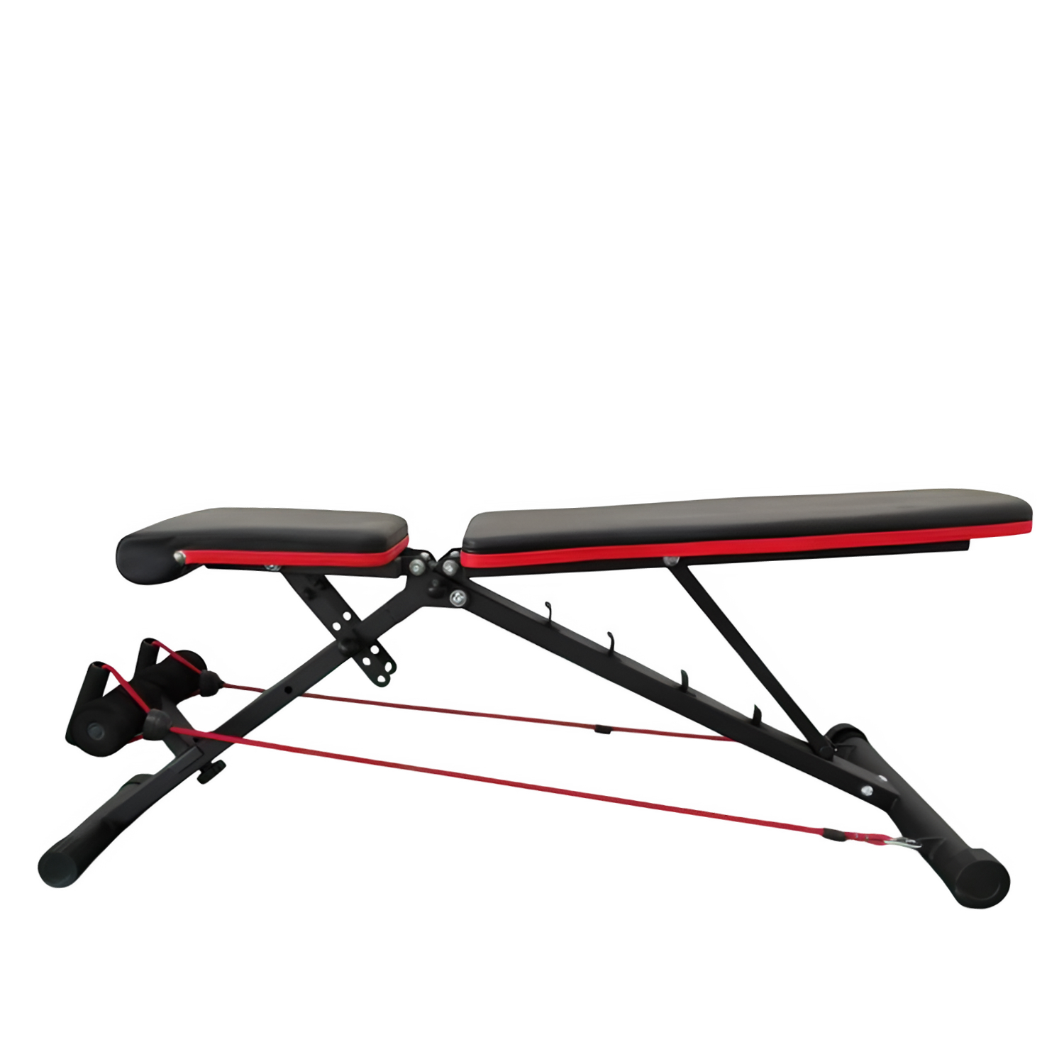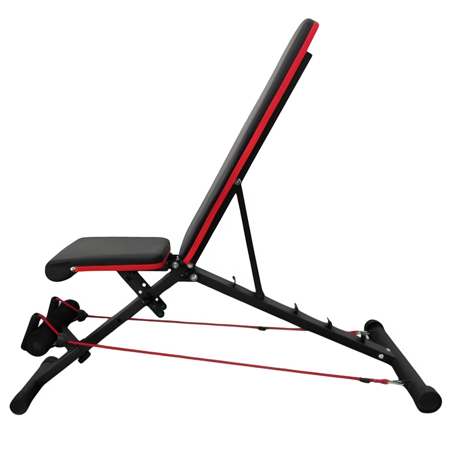 Скамья оснащена эспандерами длиной 80 см, позволяющими выполнять упражнения с дополнительным сопротивлением, а мягкие валики для ног обеспечивают комфорт и надежную фиксацию при работе над прессом и нижней частью тела.