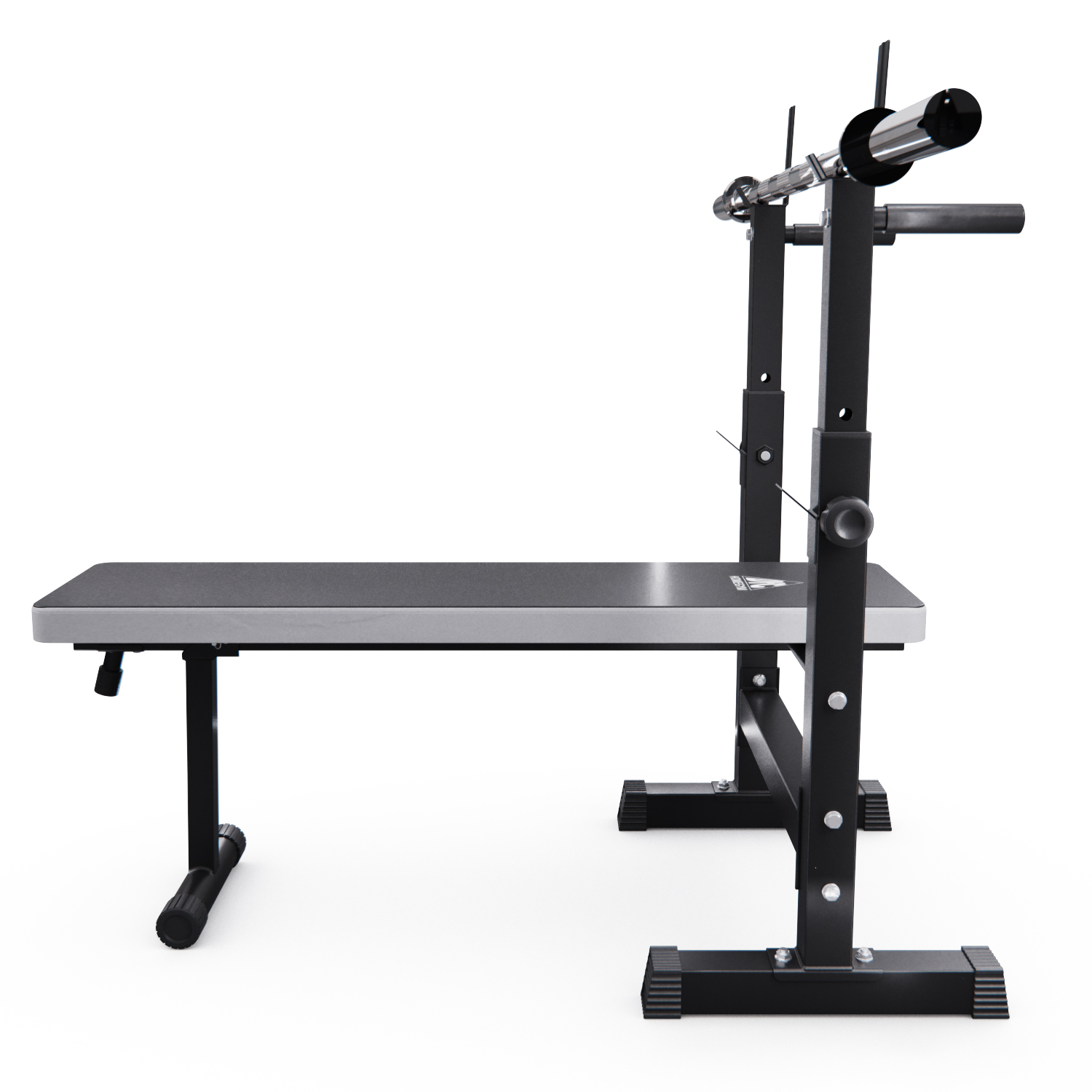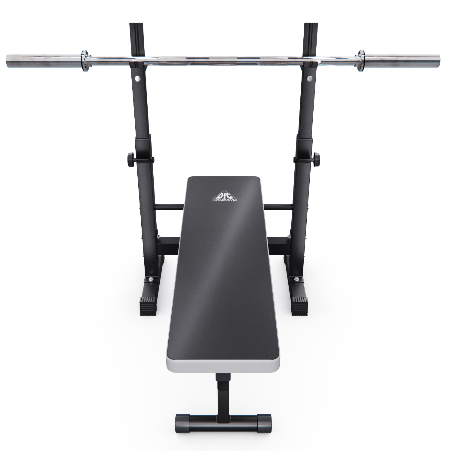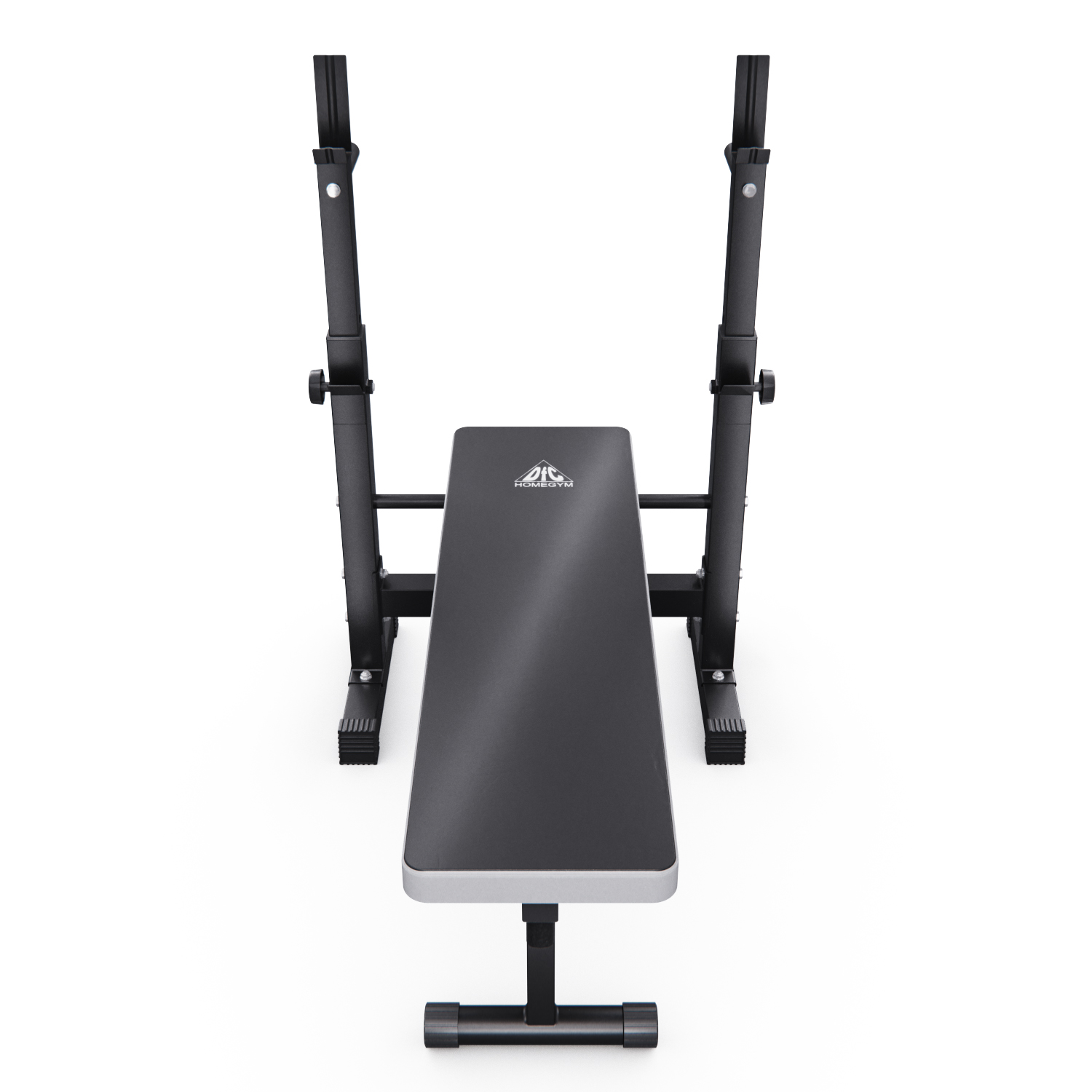 Скамья представляет собой единую складную конструкцию с основанием, обтянутым нескользящей тканью благородного серого цвета. У изголовья расположены две стойки с регулируемой высотой и двумя держателями. Верхний держатель штанги имеет ширину 62,5 см. Максимальная нагрузка на верхний держатель — 120 кг, на нижний — 100 кг. На задней части стоек есть ручки для упражнений на руки. На ножках имеются противоскользящие валики и компенсаторы неровности пола.