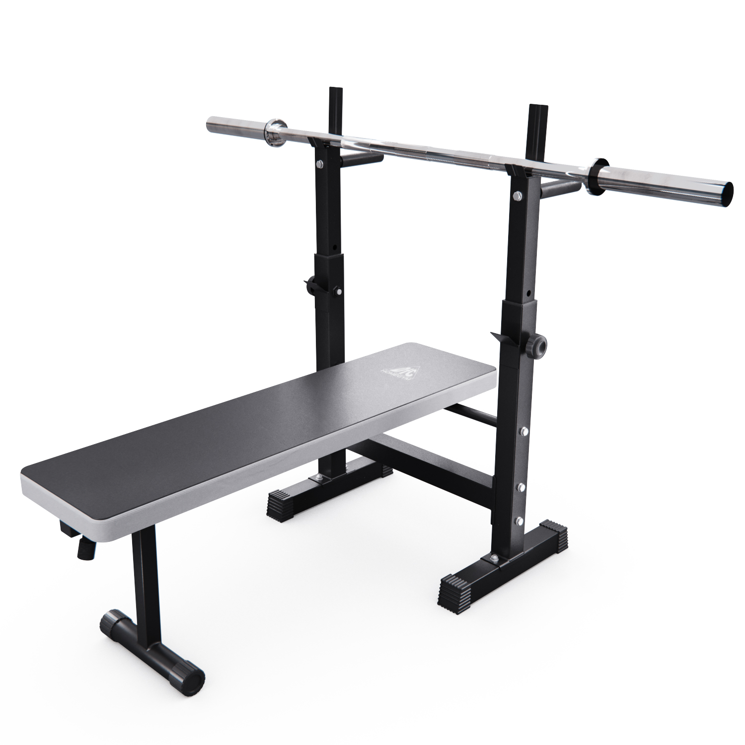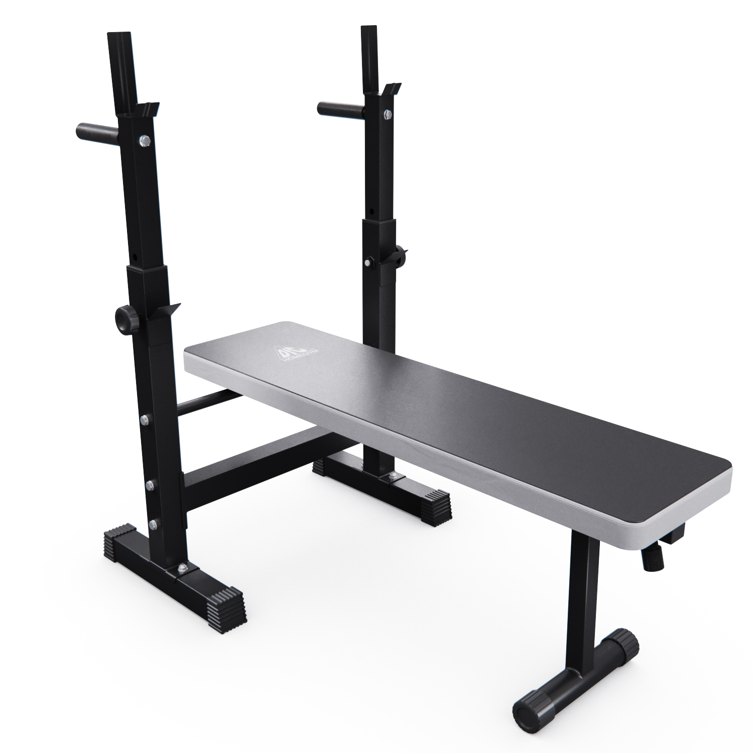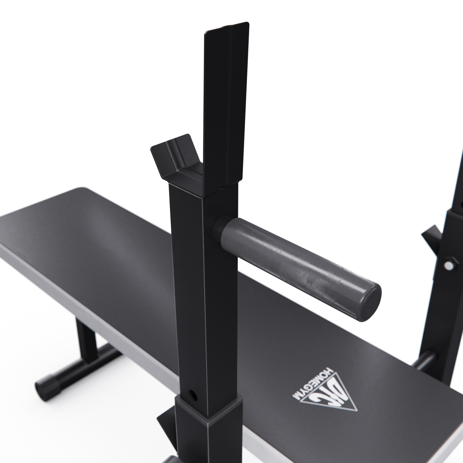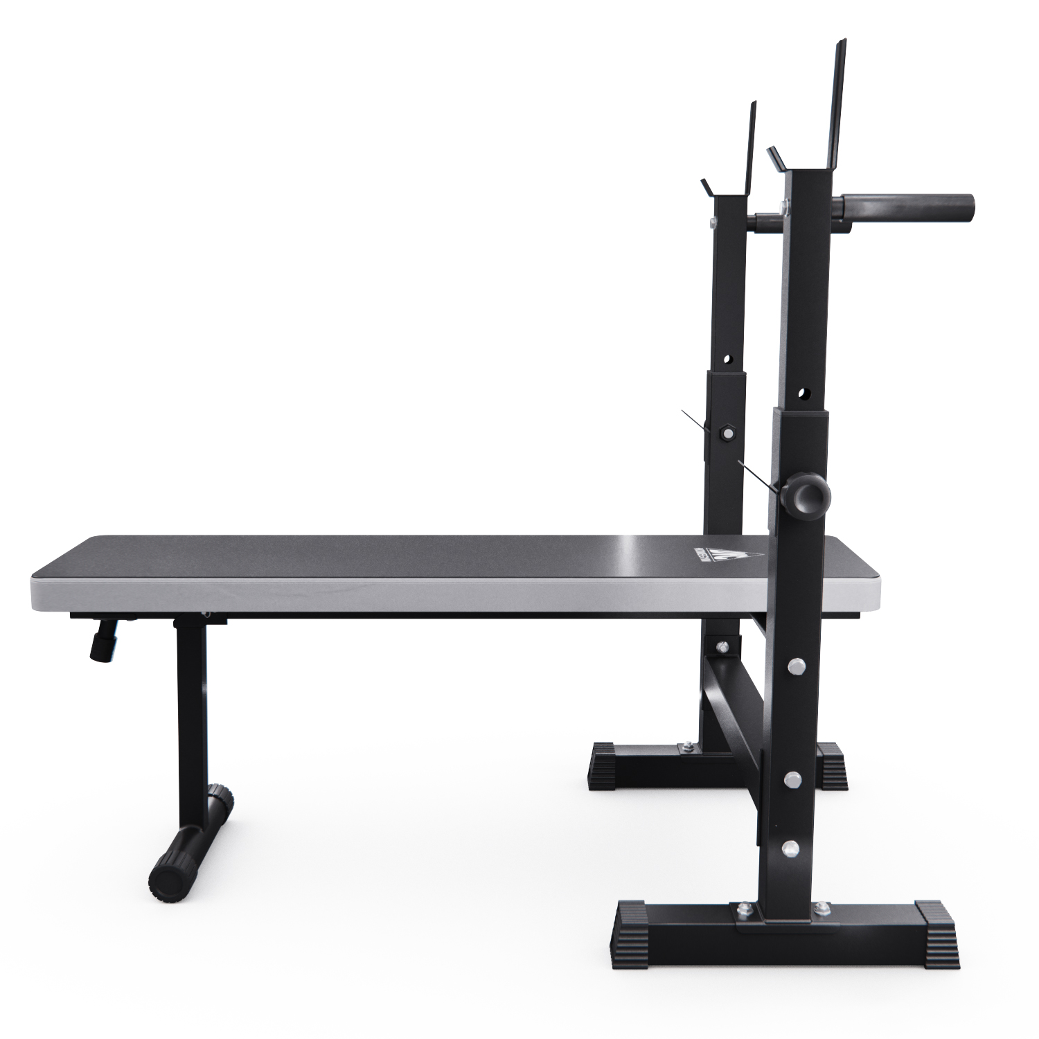 Скамья представляет собой единую складную конструкцию с основанием, обтянутым нескользящей тканью благородного серого цвета. У изголовья расположены две стойки с регулируемой высотой и двумя держателями. Верхний держатель штанги имеет ширину 62,5 см. Максимальная нагрузка на верхний держатель — 120 кг, на нижний — 100 кг. На задней части стоек есть ручки для упражнений на руки. На ножках имеются противоскользящие валики и компенсаторы неровности пола.