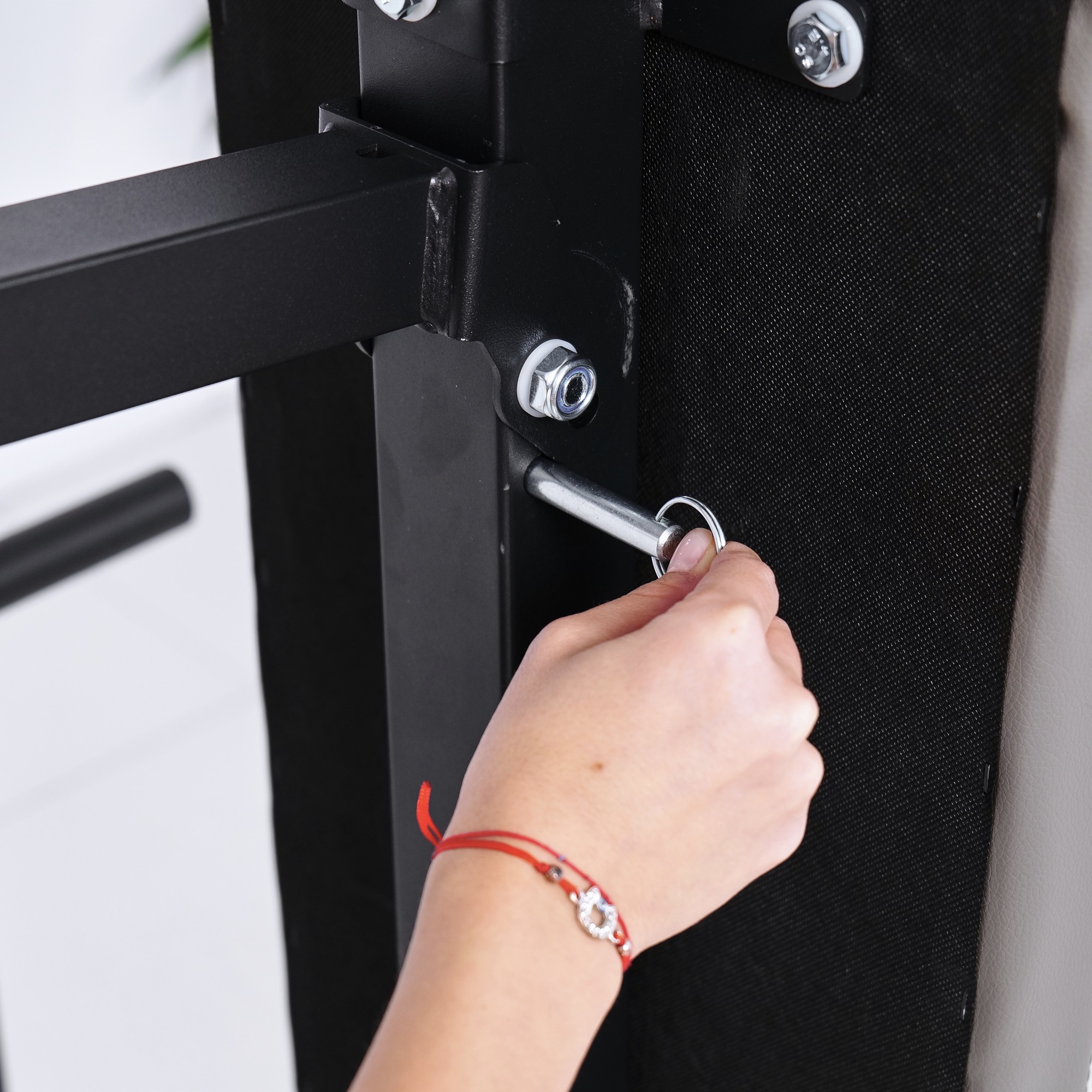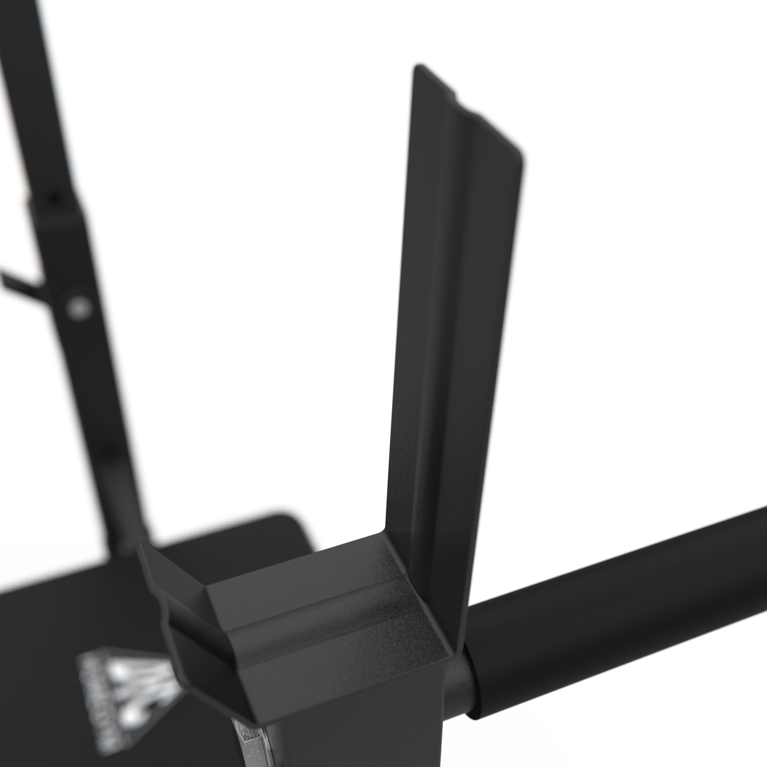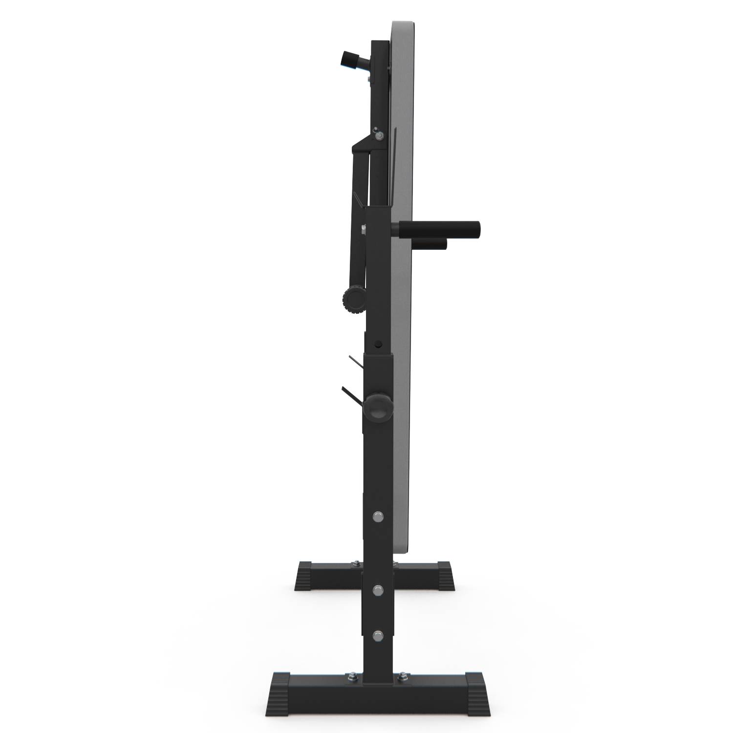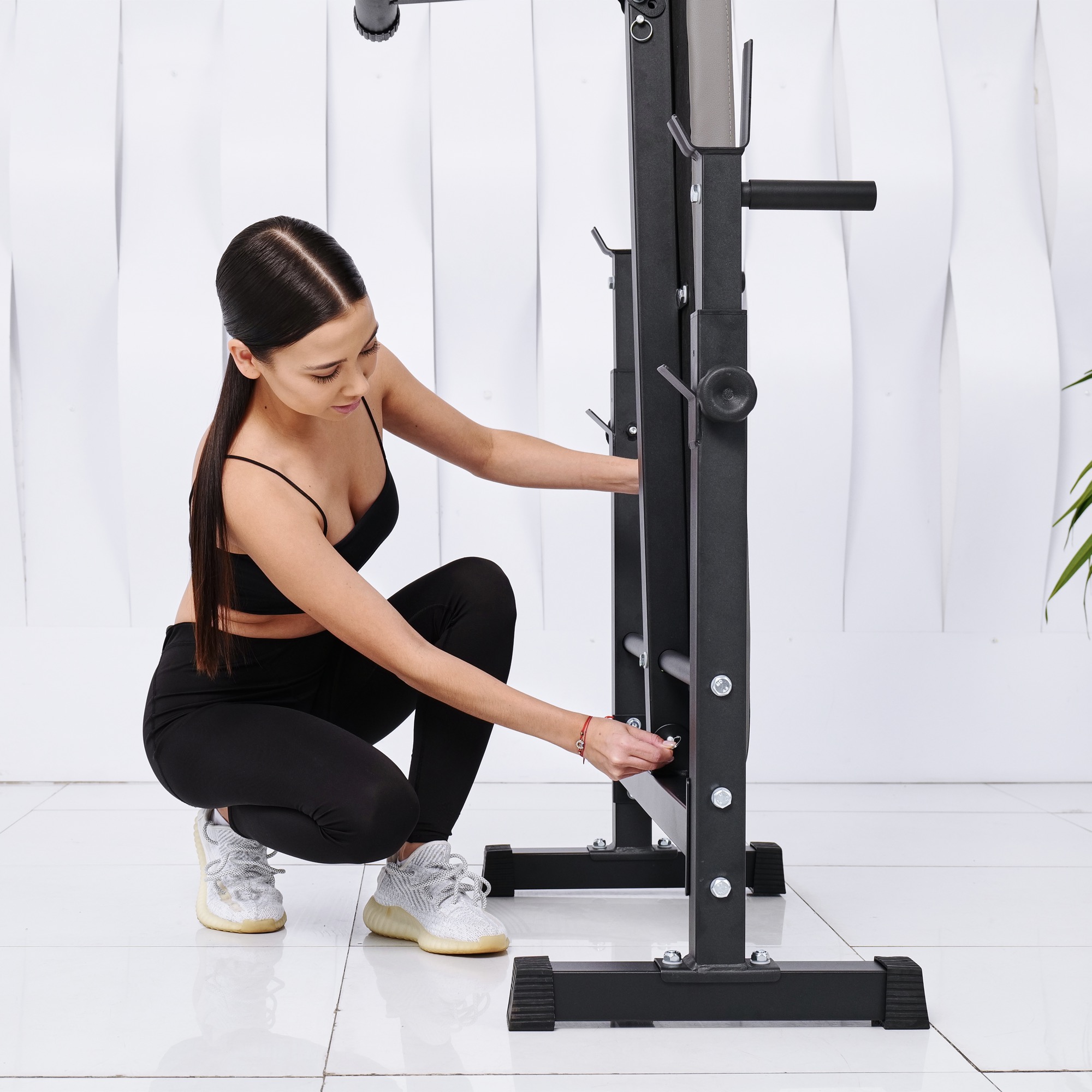 Максимальная нагрузка на верхний держатель — 120 кг, на нижний — 100 кг. На задней части стоек есть ручки для упражнений на руки. На ножках имеются противоскользящие валики и компенсаторы неровности пола.