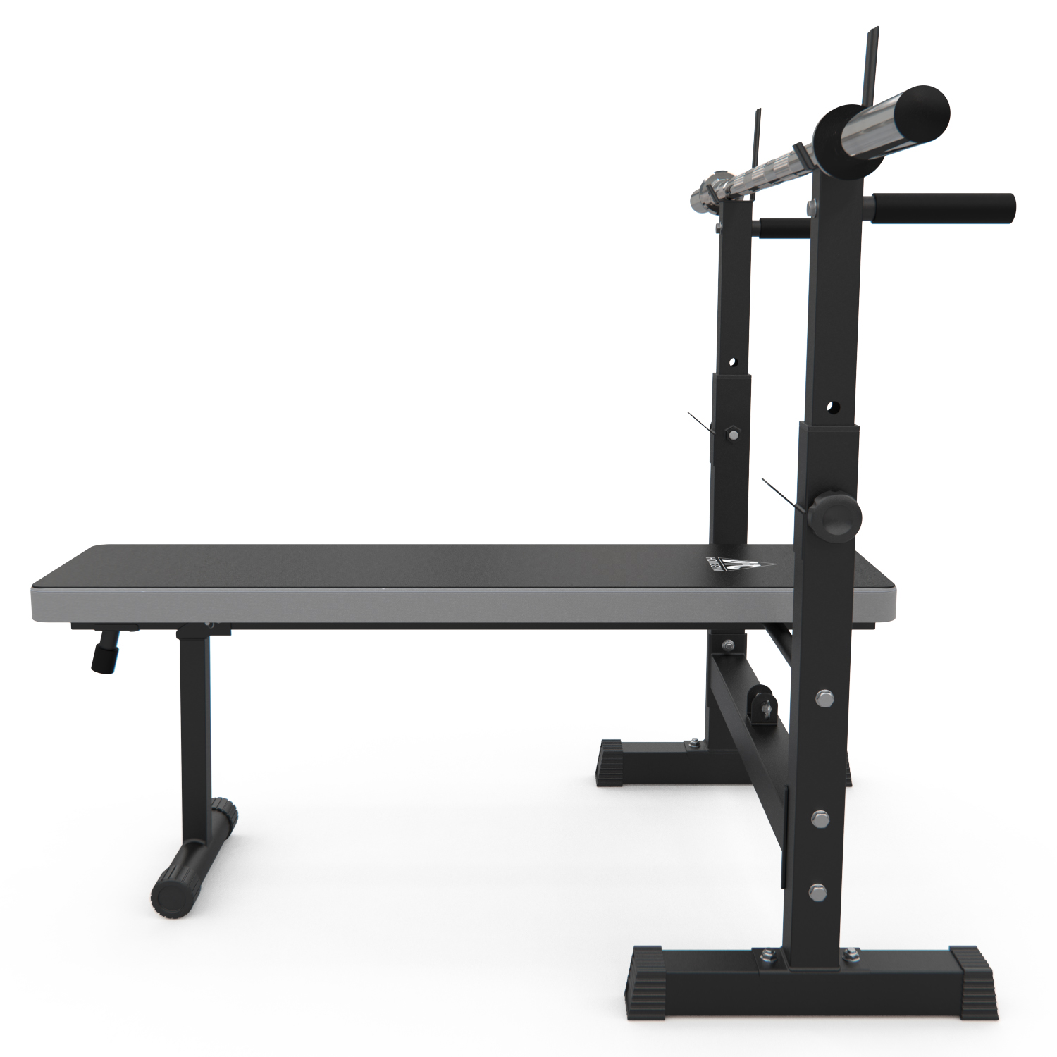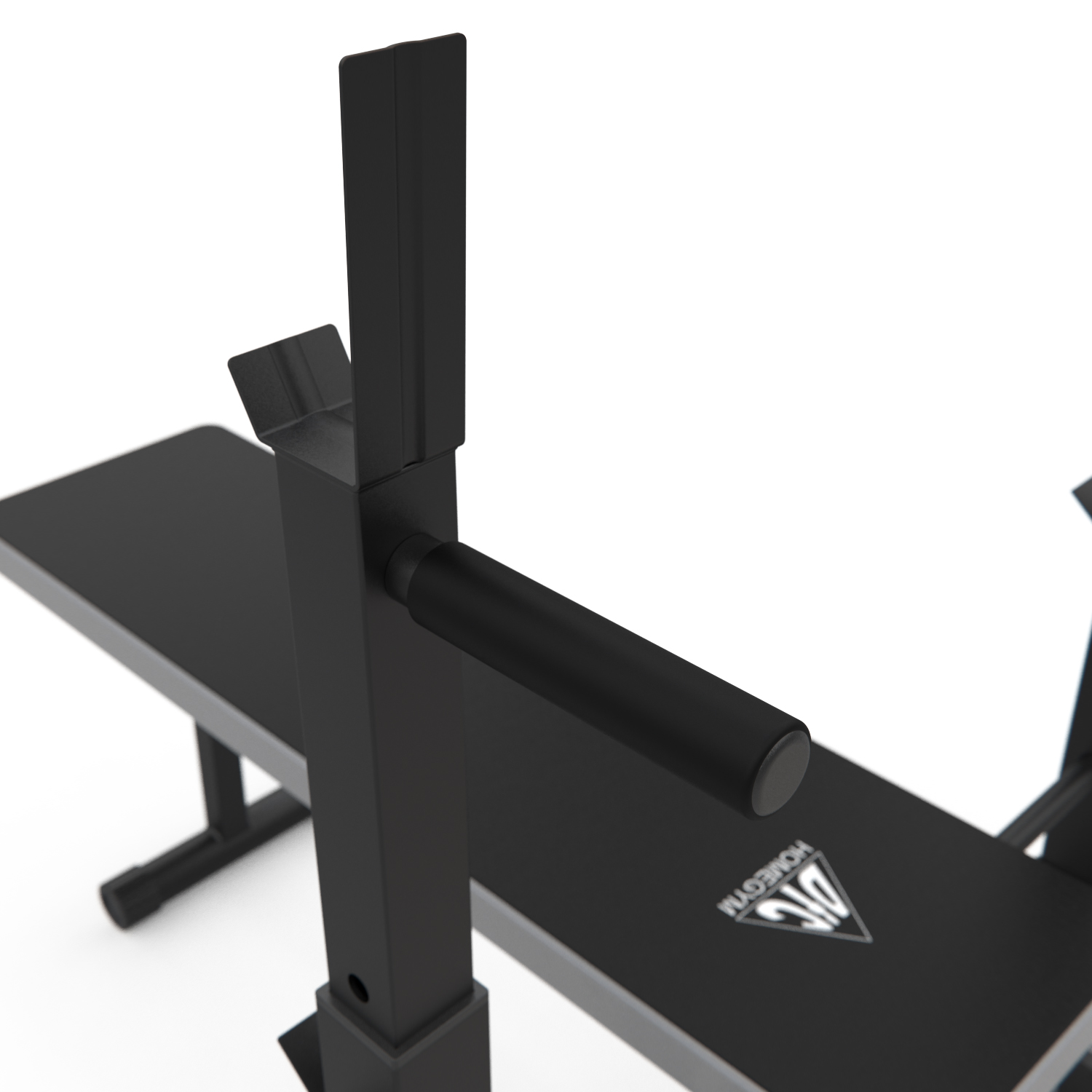 Скамья представляет собой единую складную конструкцию с основанием, обтянутым нескользящей тканью благородного серого цвета. Расстояние от скамьи до пола по нижнему краю (под скамьёй) - 42,5 см. У изголовья расположены две стойки с регулируемой высотой и двумя держателями. Верхний держатель штанги имеет ширину 81,5 см, что является отличительной особенностью скамьи в сравнении с D6453.