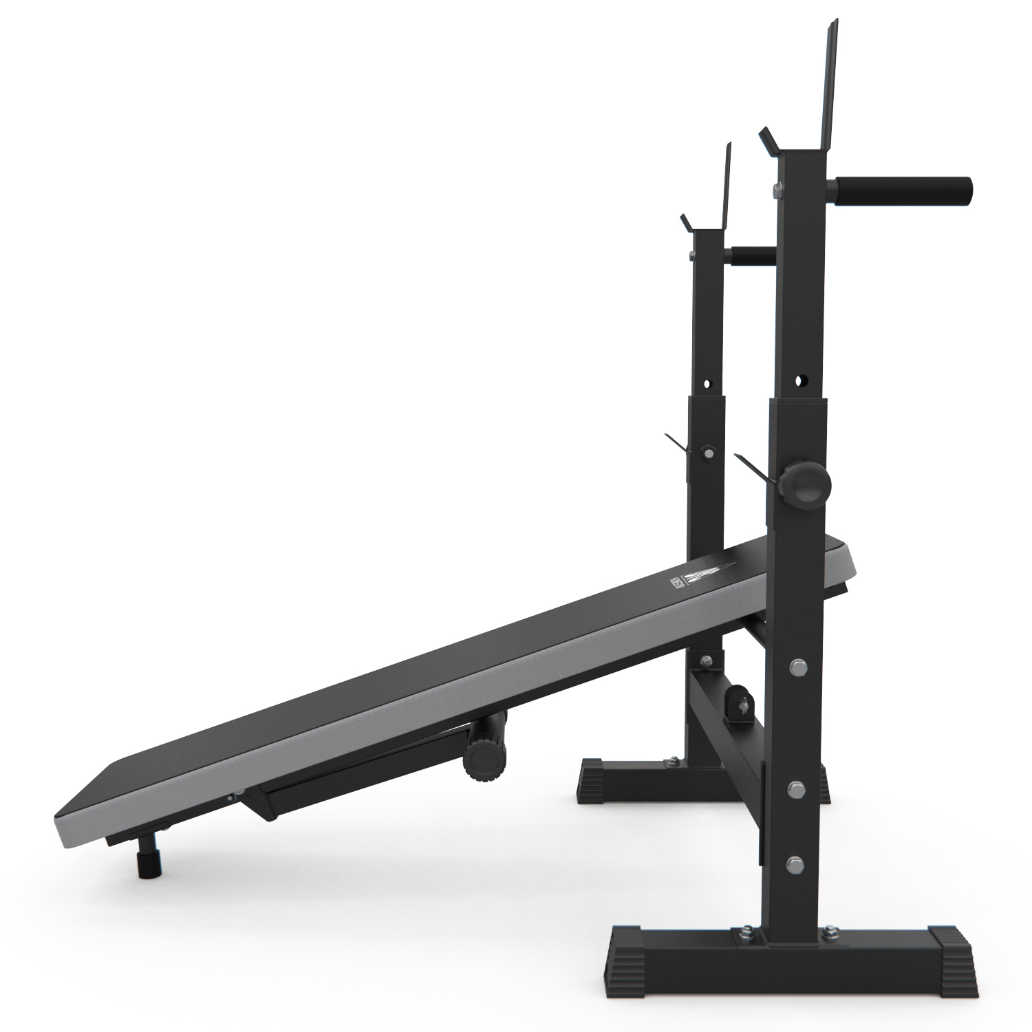 Скамью можно отрегулировать в трёх положениях с разным углом наклона: наклон 30 градусов, горизонтальное, а также вертикальное положение (в сложенном виде). Положение скамьи в наклонном виде поддерживается специальной ножкой.