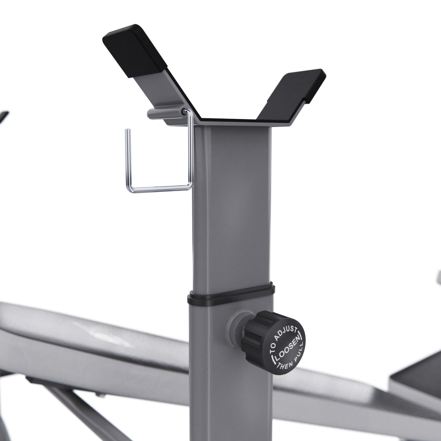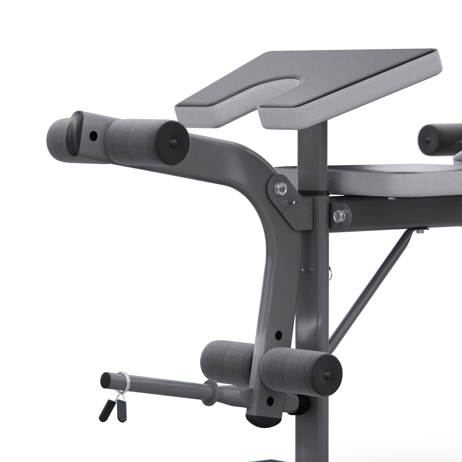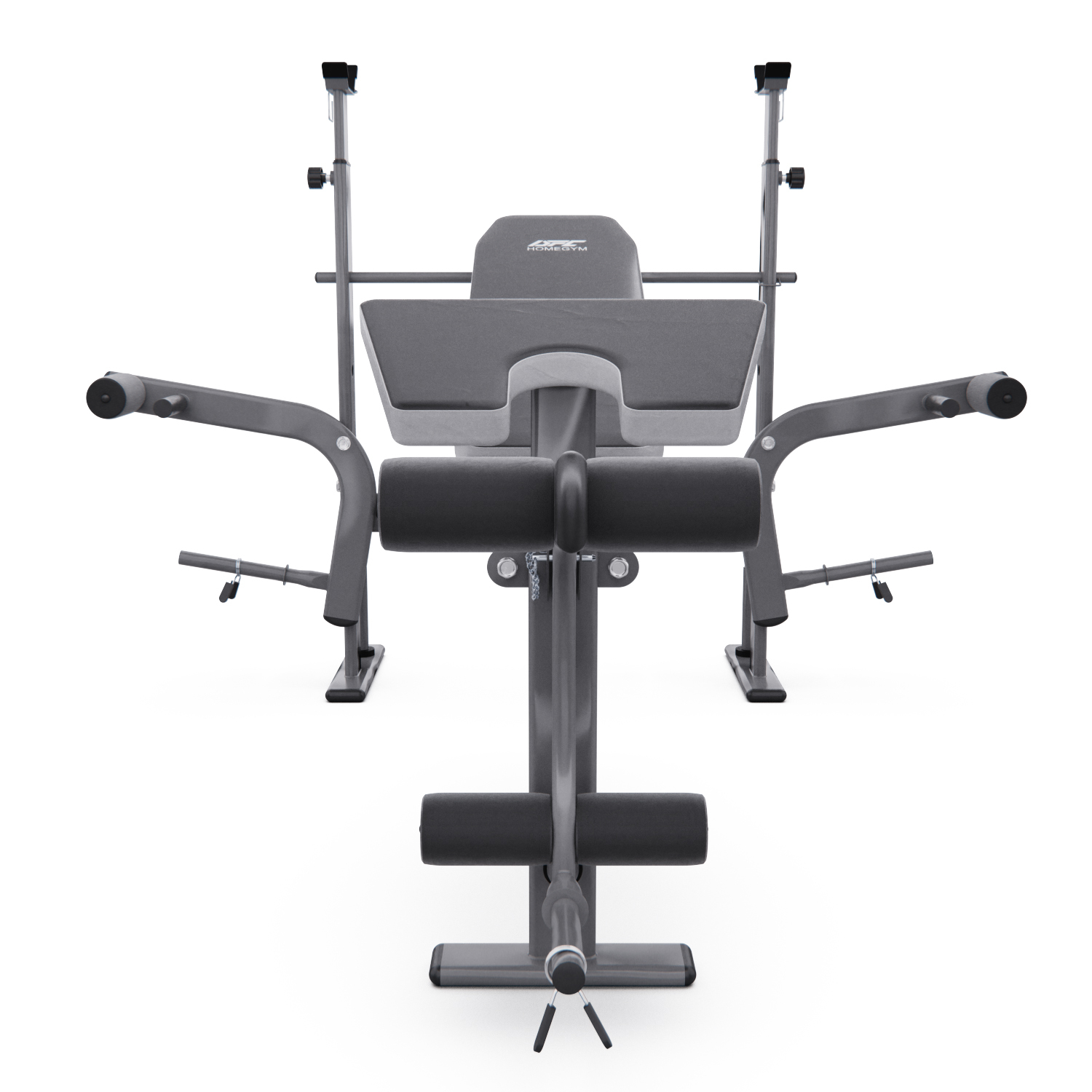 Максимальная нагрузка на стойки для штанги равна 100 кг, а расстояние между стойками 76 см. Скамья также оснащена ручным рычагом с максимальной нагрузкой до 40 кг и нагрузкой на рычаг для валиков до 80 кг. Весовые пластины не входят в комплект, но их можно приобрести отдельно.