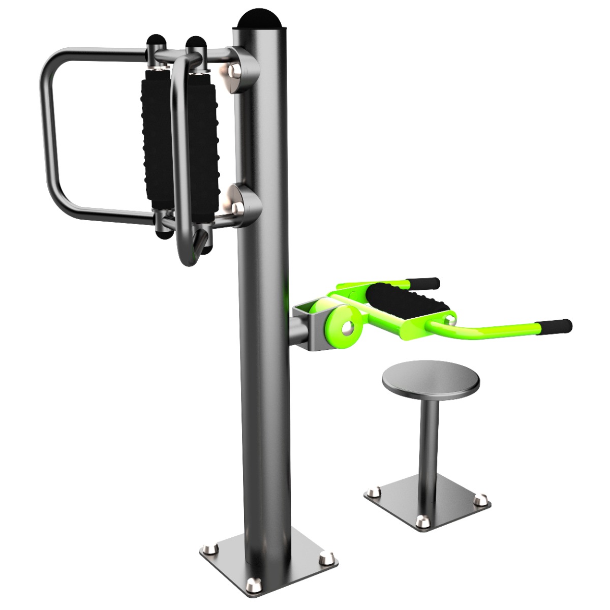 Оборудование состоит из опорного столба, сиденья, массажных узлов и закладных. Закладные монтируются в грунт и заливаются бетоном. Опорный столб и сиденье крепятся к закладным за счет фланцевого соединения и отсыпаются песчано-гравийной смесью до уровня площадки. Фланцевое крепление позволяет надёжно смонтировать оборудование и беспрепятственно демонтировать при необходимости обслуживания. Монтажные схемы прилагаются к комплекту поставки.