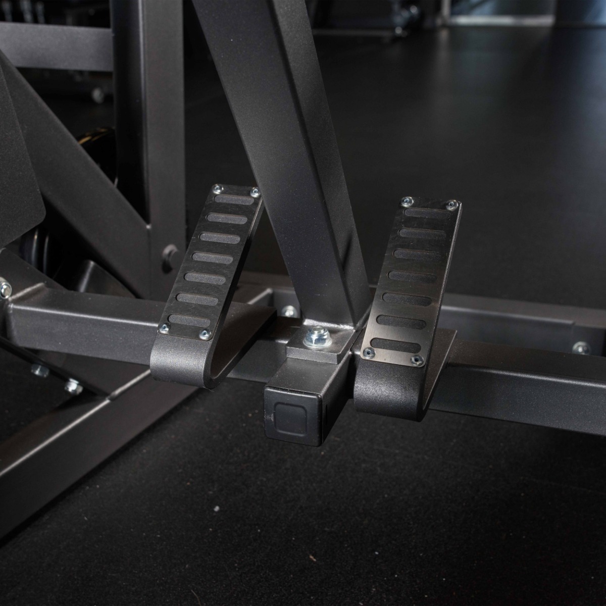 На раме закреплены две опоры под ноги из стального листа 5 мм с металлическими рубчатыми пластинами для защиты тренажера от износа и спортсмена от скольжения при выполнении упражнения.