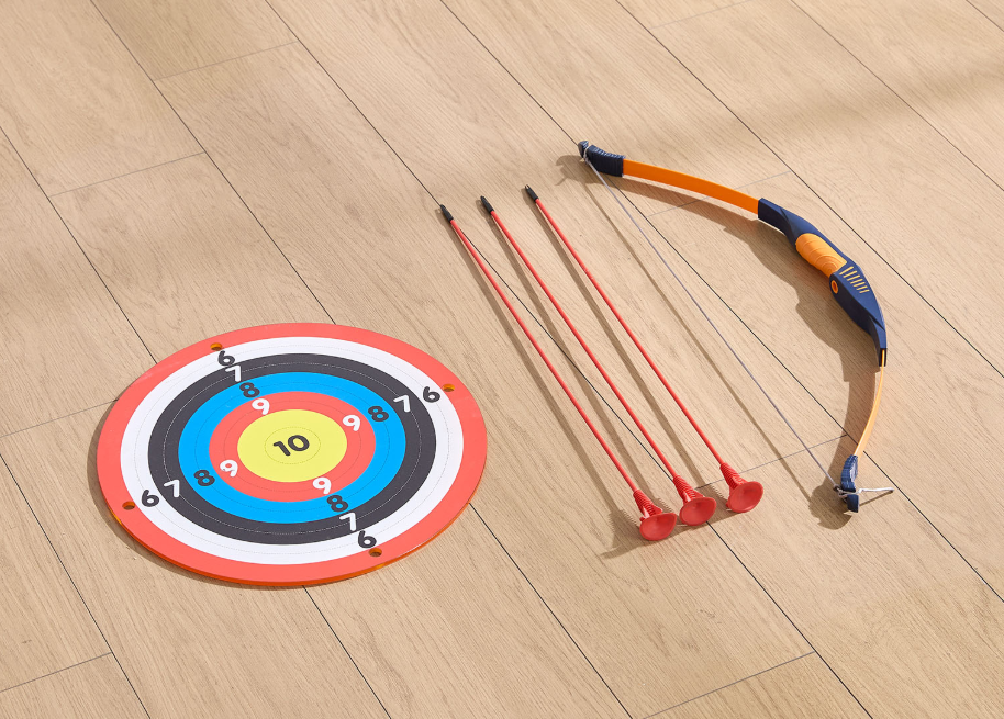 Числа на концентрических кольцах увеличиваются от 6 на внешнем круге до 10 в центре. Дети могут стрелять по мишени из длинного лука; присоски на стрелах обеспечивают их фиксацию в месте попадания. Игра привнесёт атмосферу азарта, одновременно развивая крупную моторику и координацию «глаз – рука». Сложение и вычитание набранных очков — увлекательный способ улучшить навыки устного счёта.