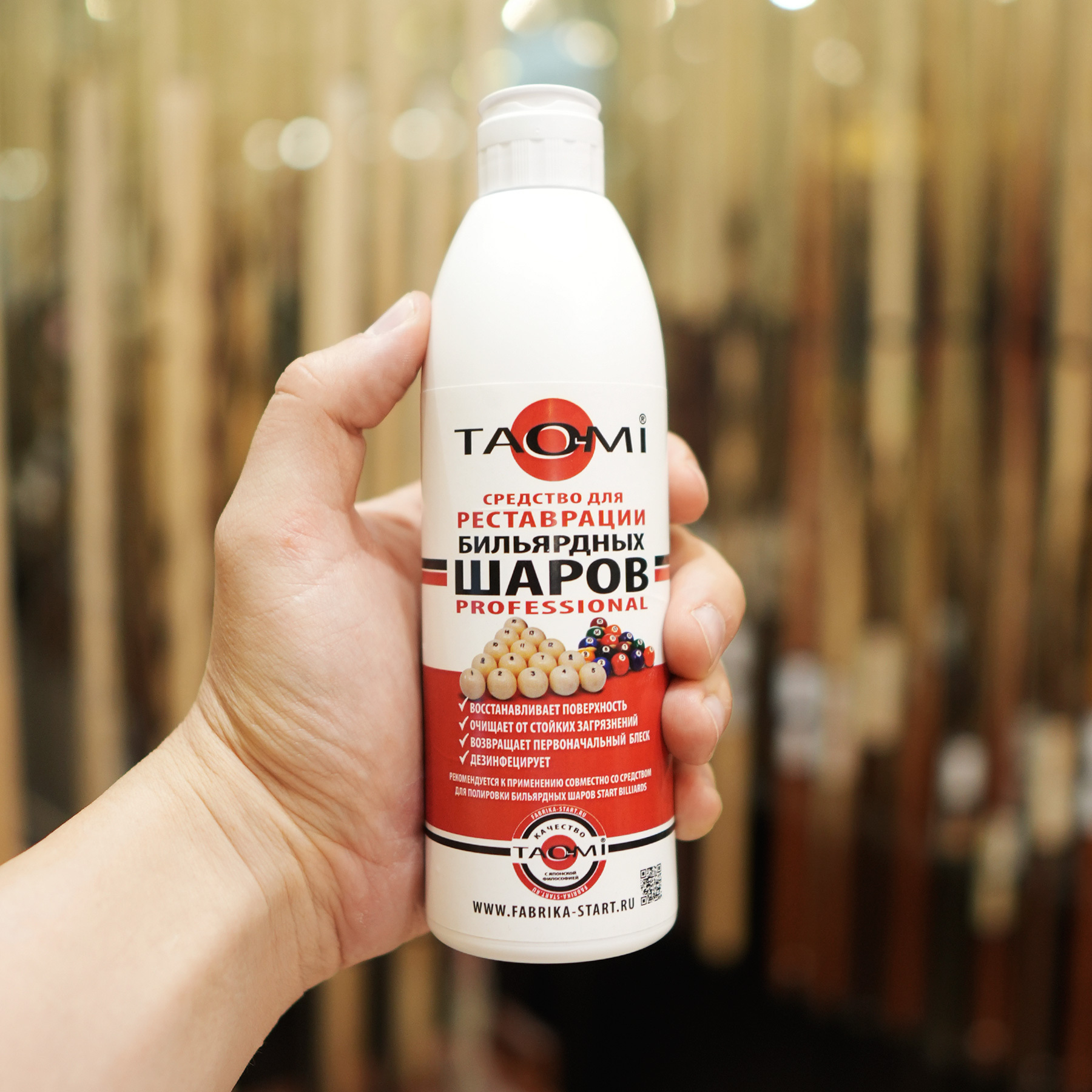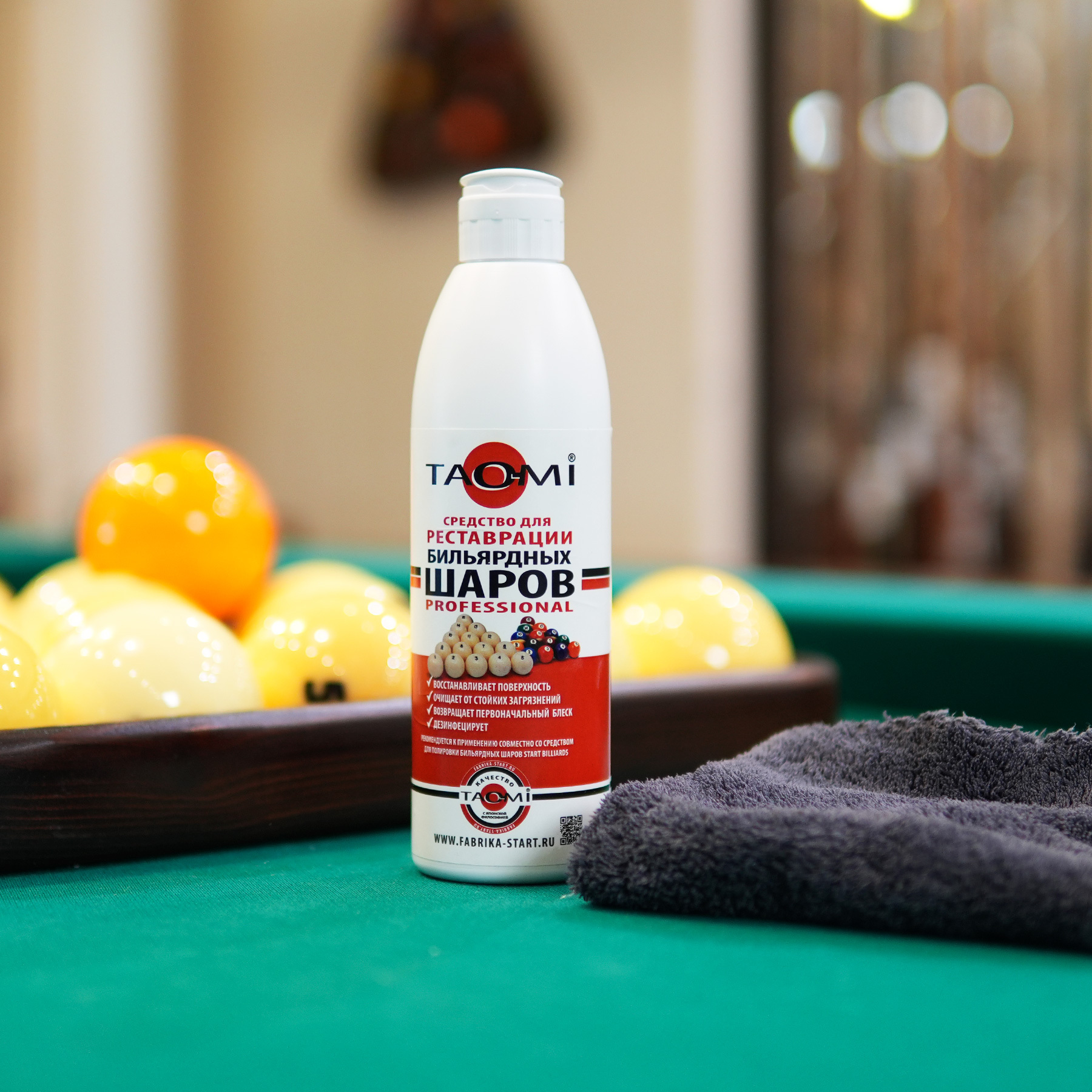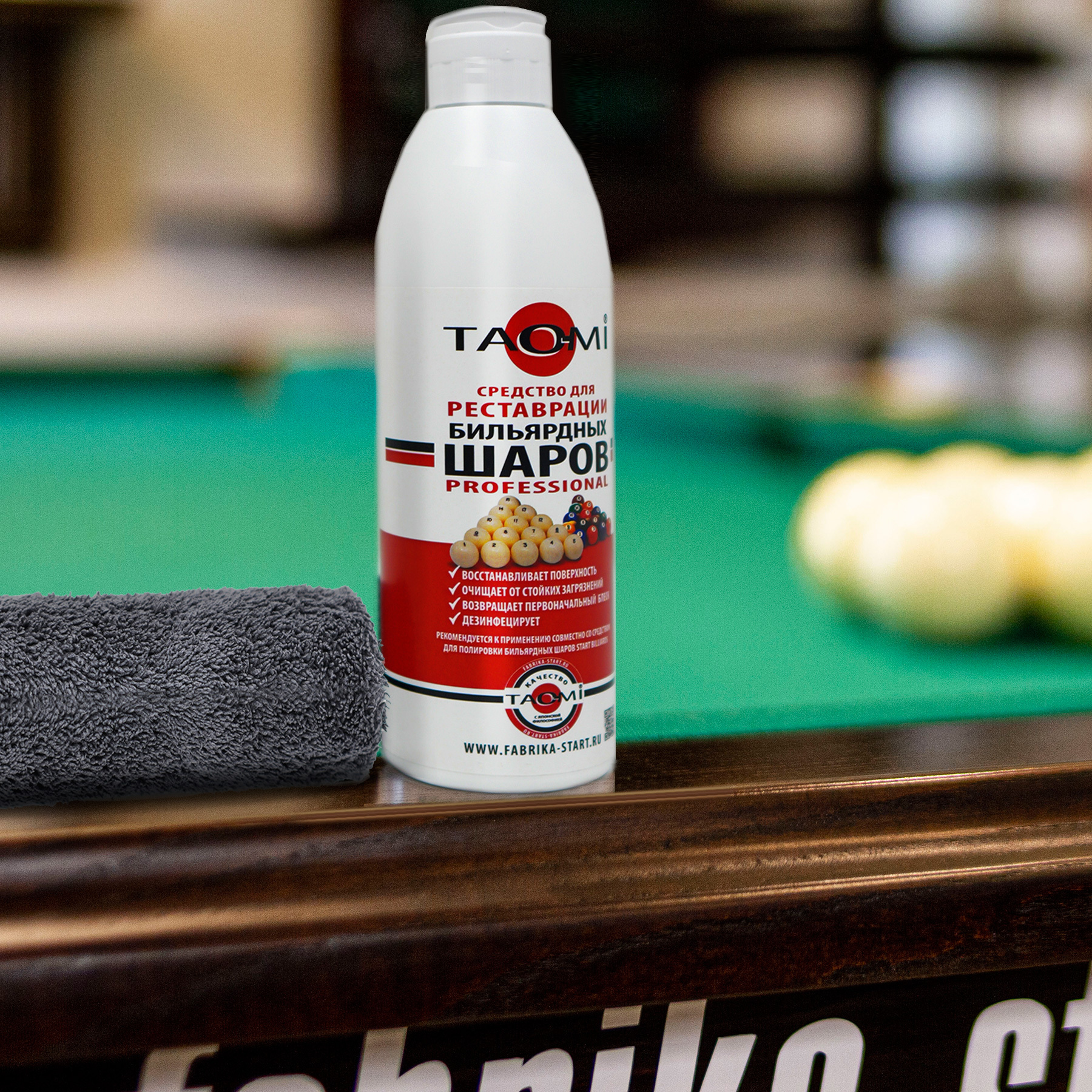 Профессиональное средство TAO-MI предназначено для комплексного ухода, очистки и реставрации бильярдных шаров. Оно эффективно справляется даже с сильными загрязнениями. Одно средство решает сразу четыре задачи: очистка, реставрация, полировка и дезинфекция.