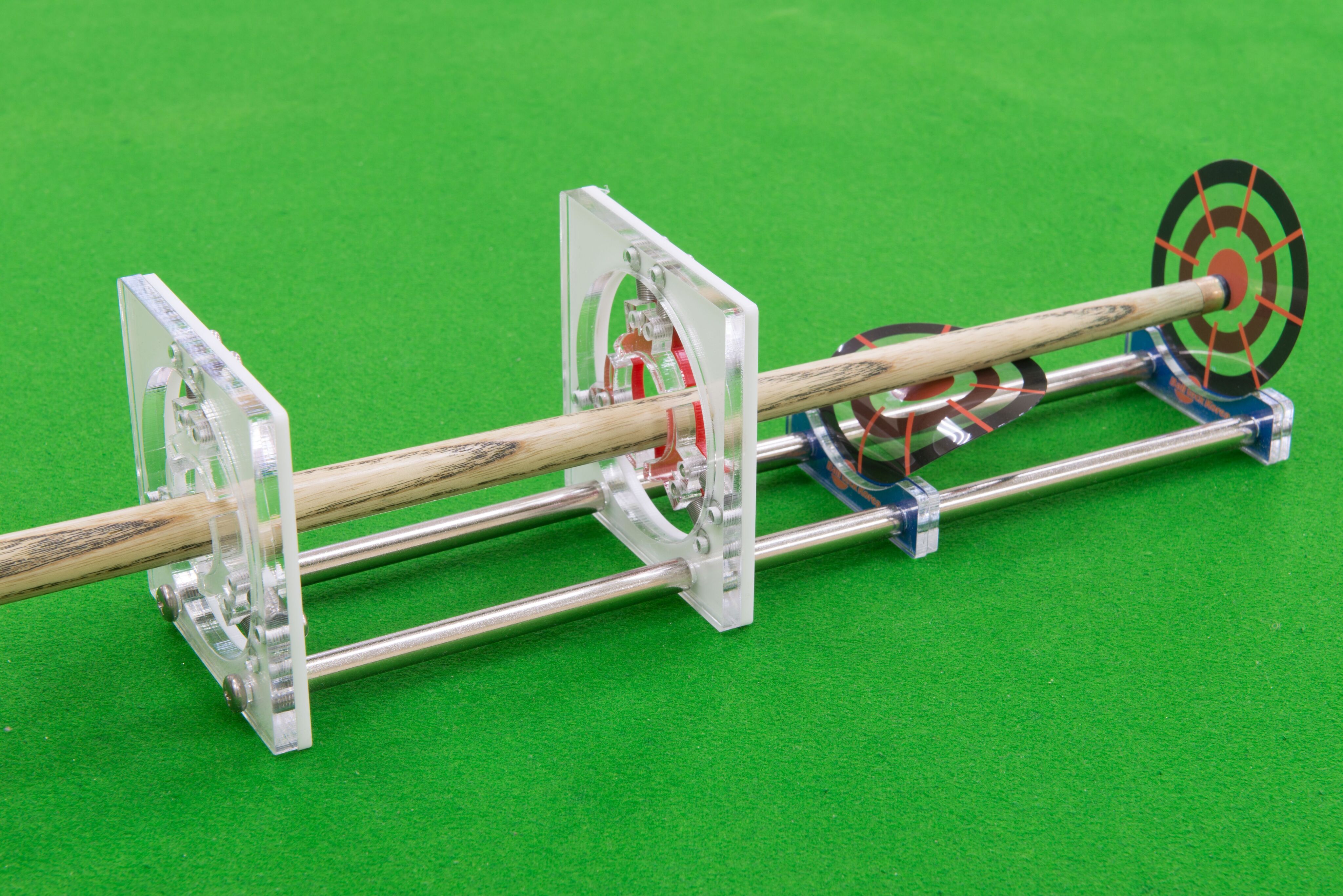 В зависимости от силы удара вы можете тренировать три различных вида проводки: короткую, среднюю и длинную. Вы можете легко определить, попали ли вы в прицельную точку и не было ли искажения линии удара. Расстояние до опорной руки (моста) составляет 80мм для тихих ударов, 150мм для средних, и 200мм для сильных ударов. Вы должны определить для себя первую прицельную точку и вторую. Например, если вы выполните прямой удар, то кий должен пройти сквозь нужную точку на первой плёнке и остановиться перед той же самой точкой на второй плёнке.