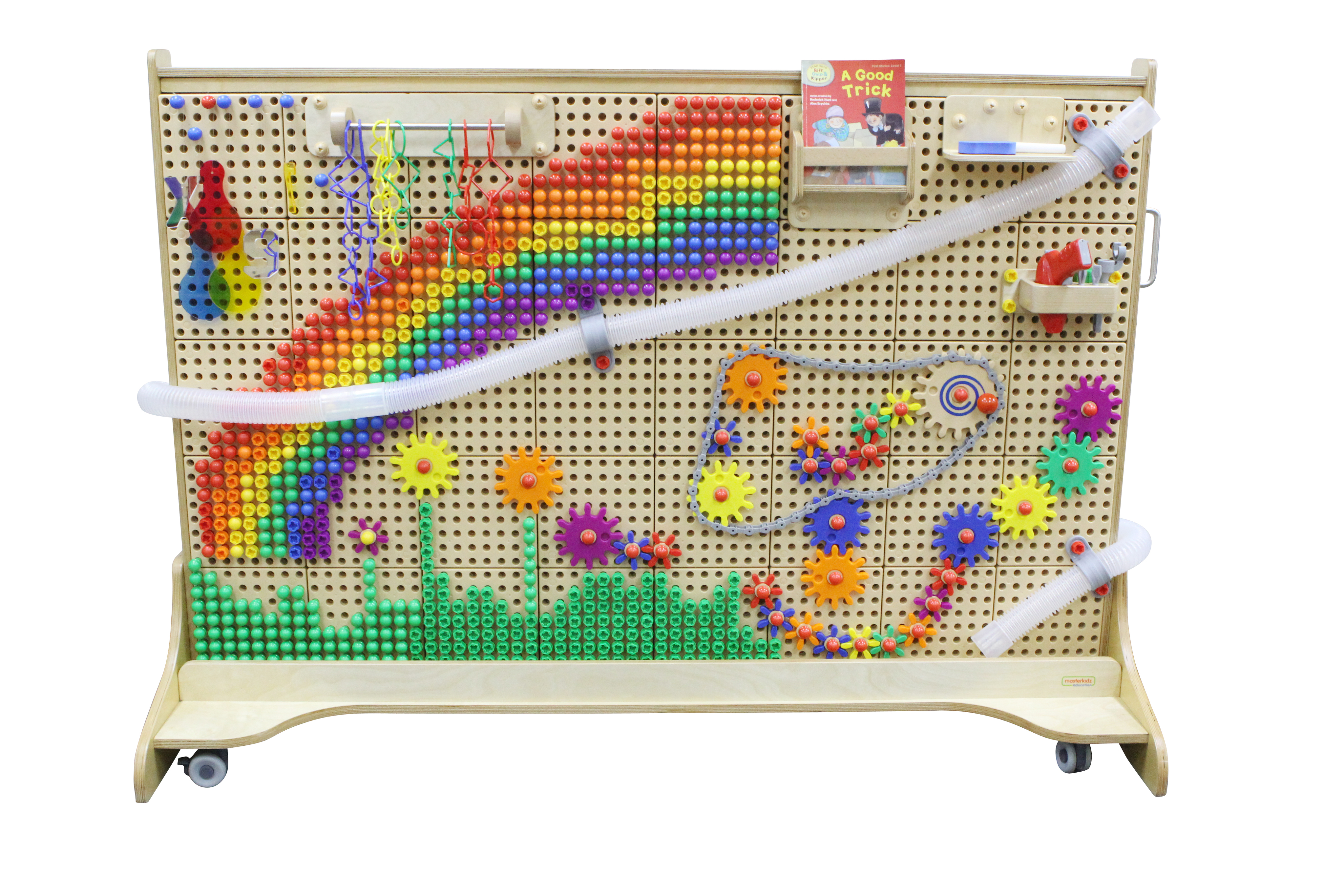 STEM стена имеет возможность установки развивающих образовательных комплектов Masterkidz, таких как колышки, сокровища, шнуровки, винты, кинетические треки, развивающие панели и множество других интересный пособий, которые обеспечивают постоянные новые задачи и позволяют детям ежедневно получать новый опыт и совершать новые открытия. Таким образом обычная стена превращается в супер - игрушку для веселого и интерактивного обучения!