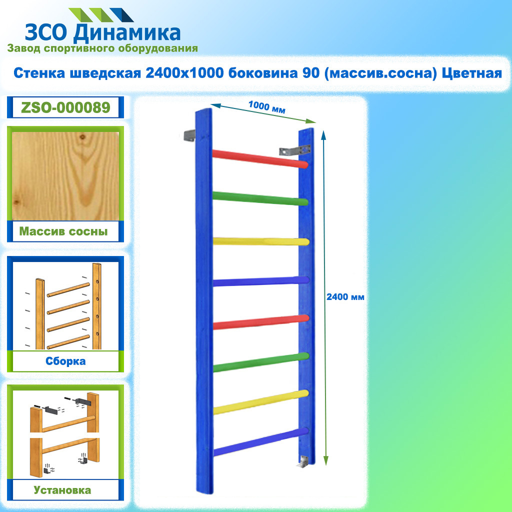 Стенка шведская / гимнастическая (массив.сосна) - представляет собой сборную конструкцию, состоящую из двух боковин изготовленных из дерева (массива сосны) и круглых перекладин из березовой фанеры. Наружные края стенок имеют закругленную форму, что уменьшает риск получения травм во время использования изделия во время тренировок. Поверхность шведской стенки тщательно отшлифована и покрыта эмалью глянцевой ЕВРО и одним слоем высококачественного трехкомпонентного лака. Конструкция и метод крепления перекладин исключают возможность поворота во время эксплуатации. Для крепления к стене и полу используются уголки крепежные. Поставляется в разобранном виде.