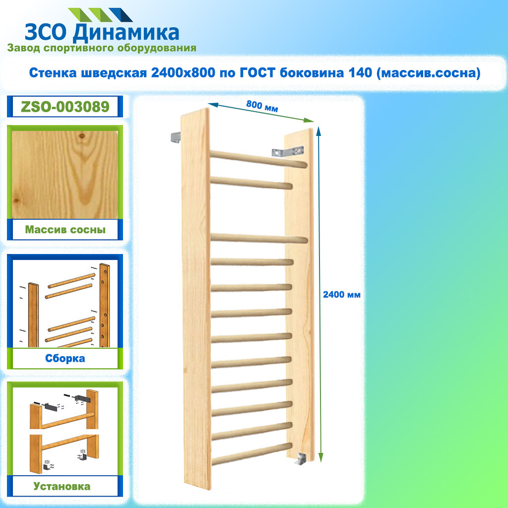 Стенка шведская / гимнастическая по ГОСТ (массив.сосна) - представляет собой сборную конструкцию, состоящую из двух боковин изготовленных из дерева (массива сосны) и круглых перекладин из березовой фанеры. Наружные края стенок имеют закругленную форму, что уменьшает риск получения травм во время использования изделия во время тренировок. У верхней части шведской стенки расположен небольшой пробел с выступающими перекладинами, которые можно использовать в качестве турников. У стенок по ГОСТу более частый шаг перекладин. Поверхность шведской стенки тщательно отшлифована и покрыта двумя слоями высококачественного трехкомпонентного лака. Конструкция и метод крепления перекладин исключают возможность поворота во время эксплуатации. Для крепления к стене и полу используются уголки крепежные. Поставляется в разобранном виде.