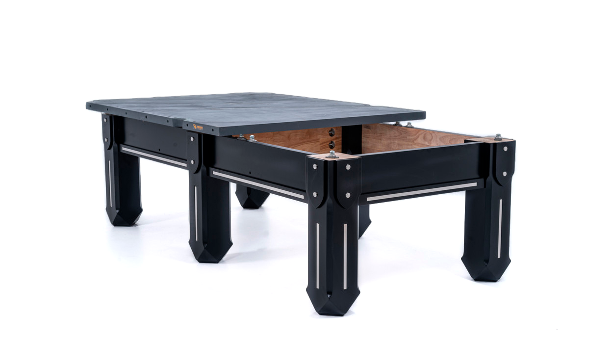 Идеальный уровень игрового поля достигается за счет уникальной системы выравнивания: 12 регулировочных болтов равномерно распределены по каркасу таким образом, что каждая плита поддерживается 4 болтами для тонкой настройки. Бильярдному столу не страшны внешние вибрации и деформация, вызываемая сидящими на углах игроками. Конструкция стабильна при высоких игровых нагрузках.