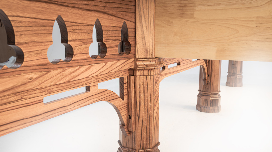 Стол Gothic Dynasty вдохновлен архитектурными элементами готики, что находит отражение в строгих линиях и изящных деталях. Борта и каркас стала изготовлены из массива древесины экзотической породы дерева - Эбиара (происхождение: Габон, Африка). Сегодня Эбиара уже запрещена к вырубке в некоторых африканских странах и занесена в Красную книгу, поэтому является редкой и дорогой древесиной. Это дерево имеет высокую плотность, Эбиара тверже дуба и бука, её плотность в среднем от 700 до 720 кг/м³. Перед обработкой дерево проходит 12-летний цикл естественной сушки, что позволяет достичь оптимальной влажности.