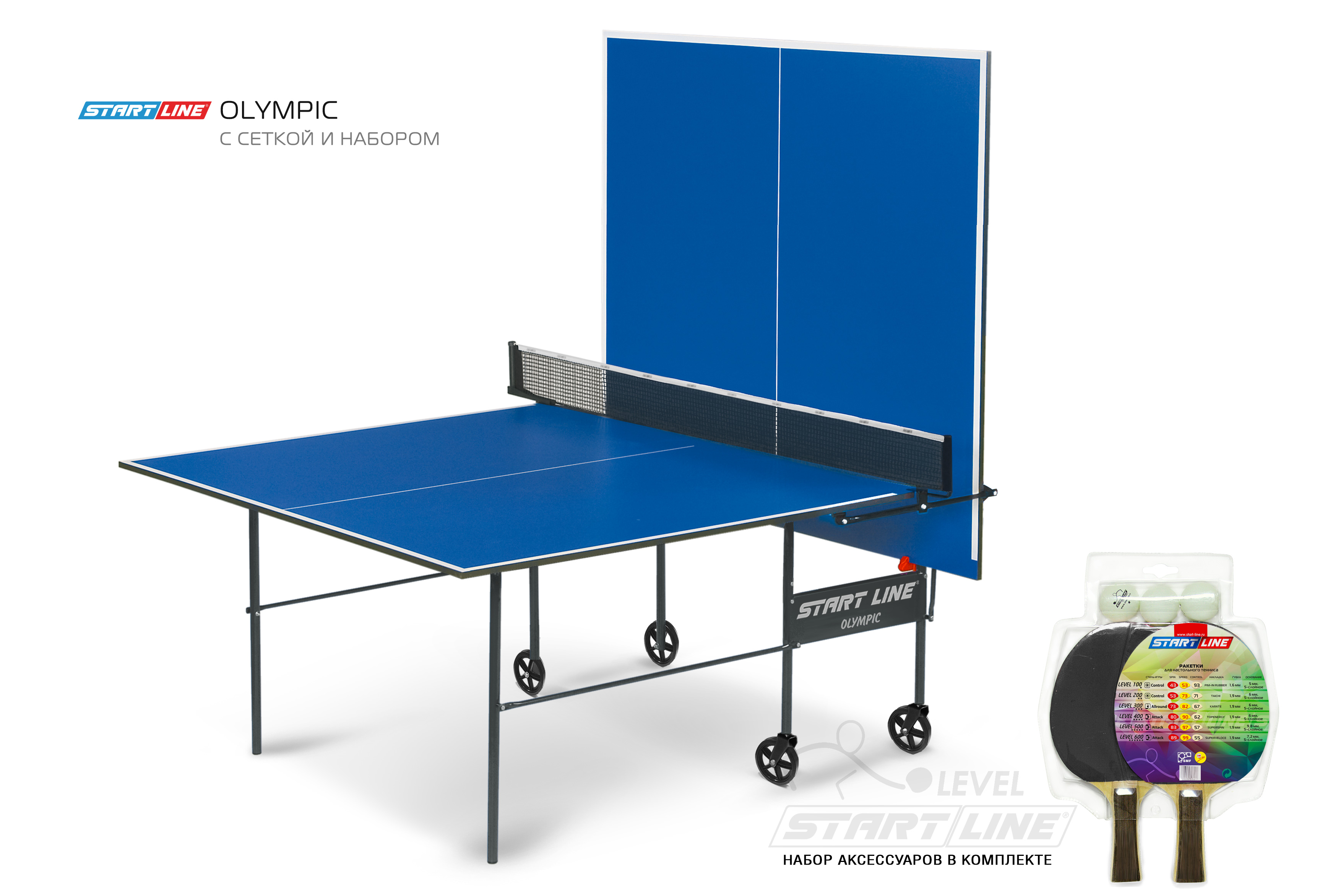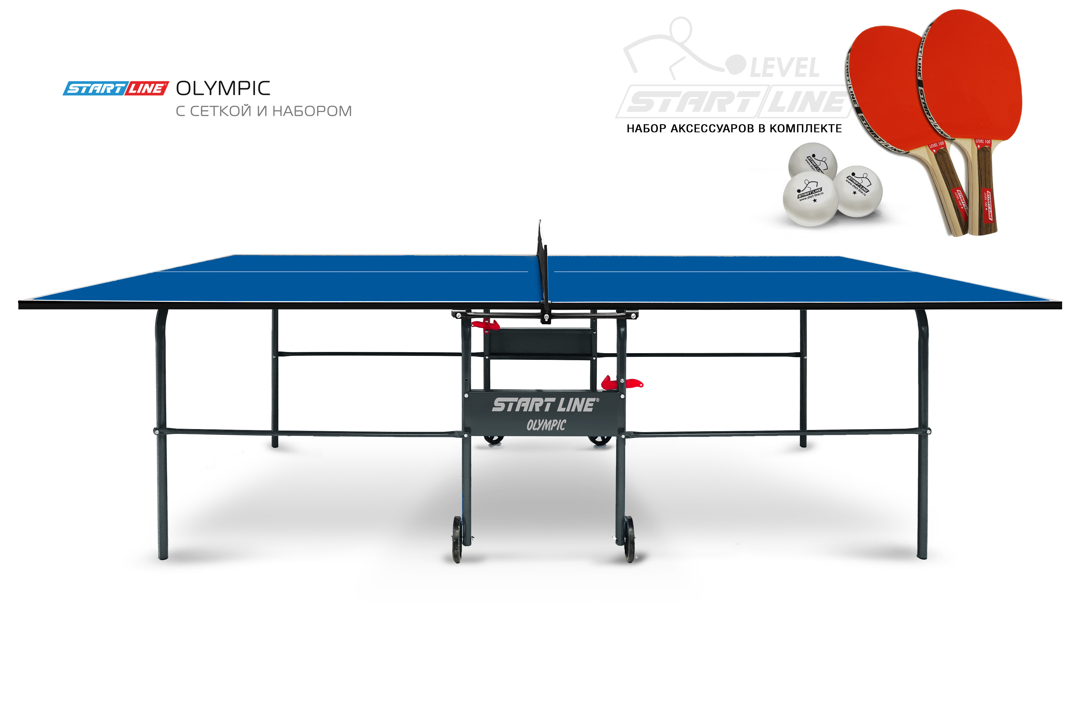 Olympic оборудован встроенной сеткой, не требующей демонтажа при складывании. В комплекте со столом идет набор со всеми необходимыми для игры аксессуарами: 2 ракетки Level 100, 3 теннисных мяча Club Select.