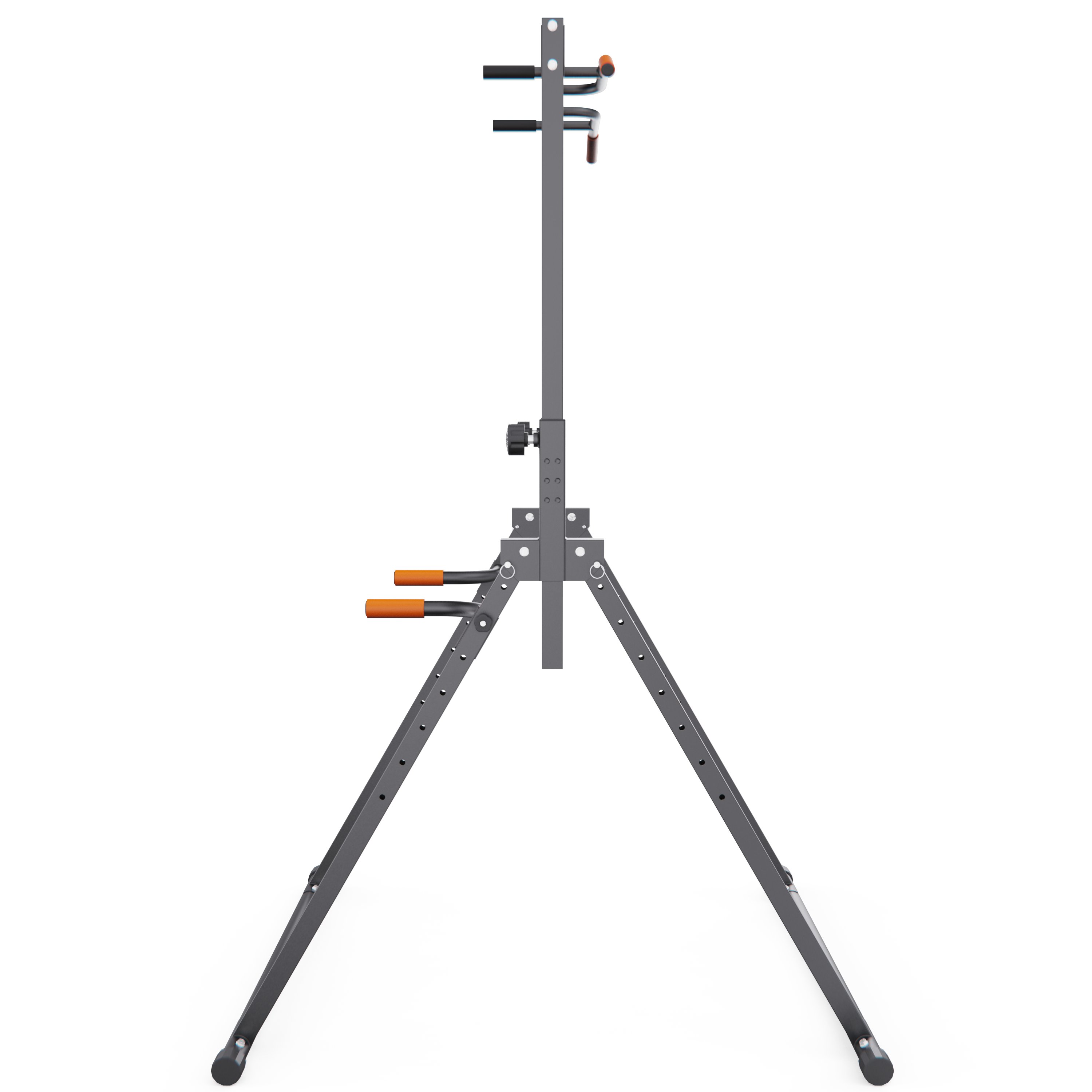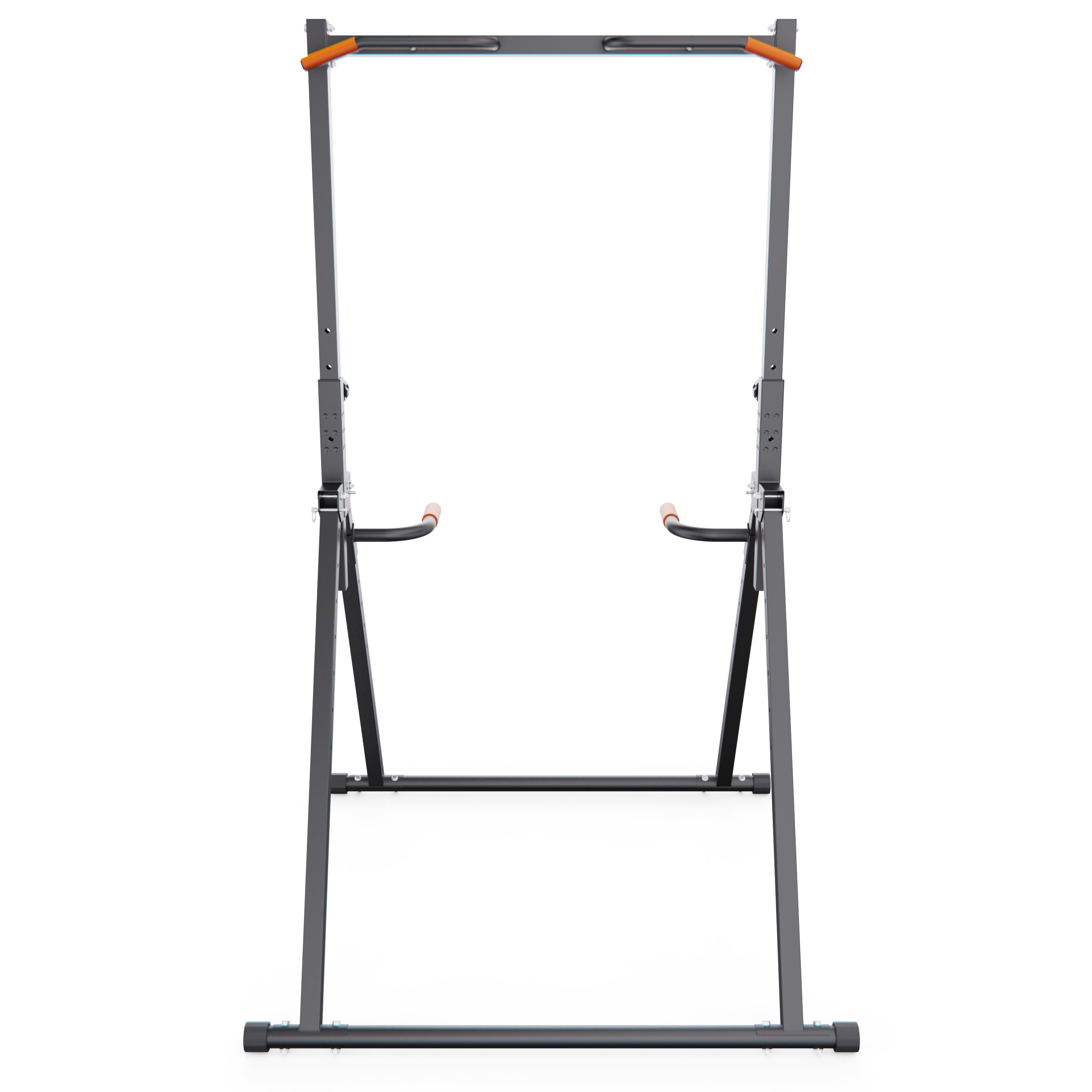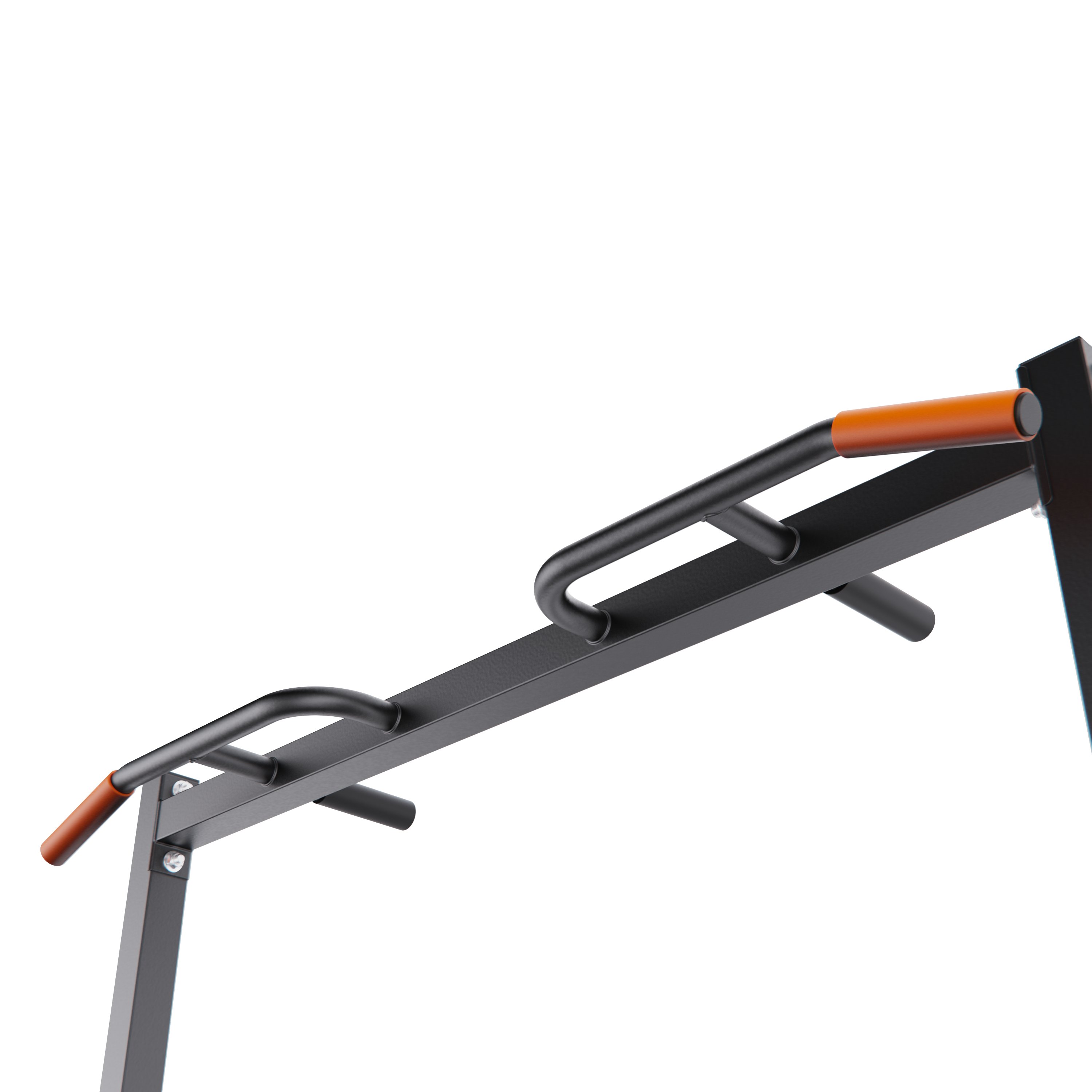 Верхняя перекладина для подтягиваний длиной 100,5 см с диаметром хвата 25 мм обеспечивает удобный и надежный захват. Нижняя поперечная перекладина длиной 63 см и диаметром 32 мм предназначена для выполнения отжиманий и других упражнений. Высота стойки регулируется по 7 уровням с общим диапазоном изменения 49 см. Нижняя часть рамы дополнительно имеет 8 уровней регулировки.