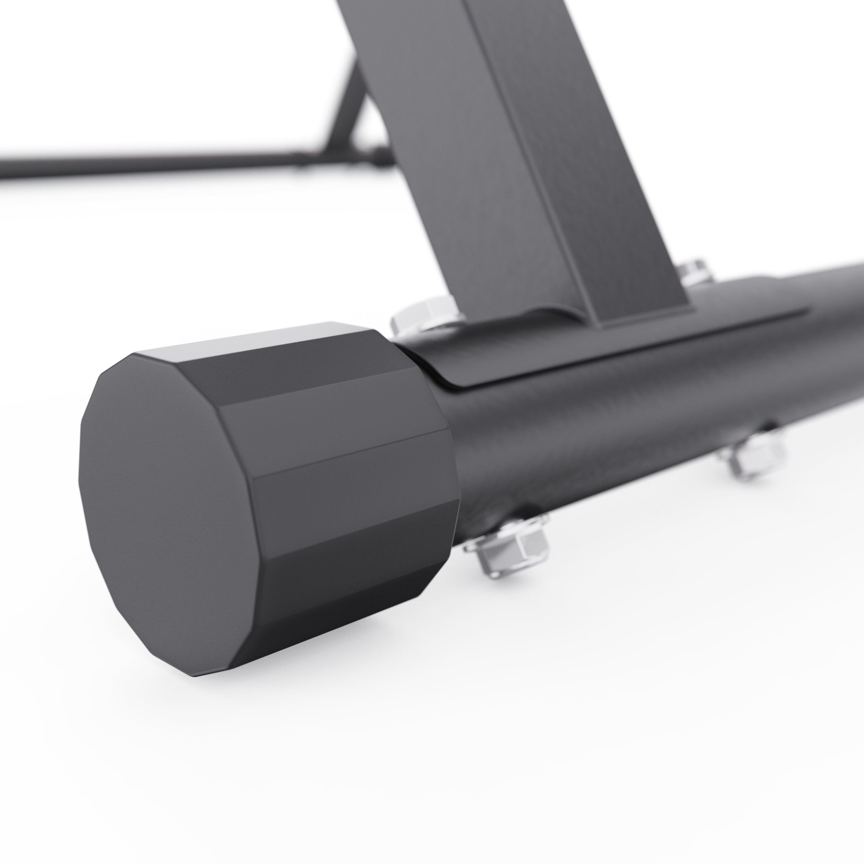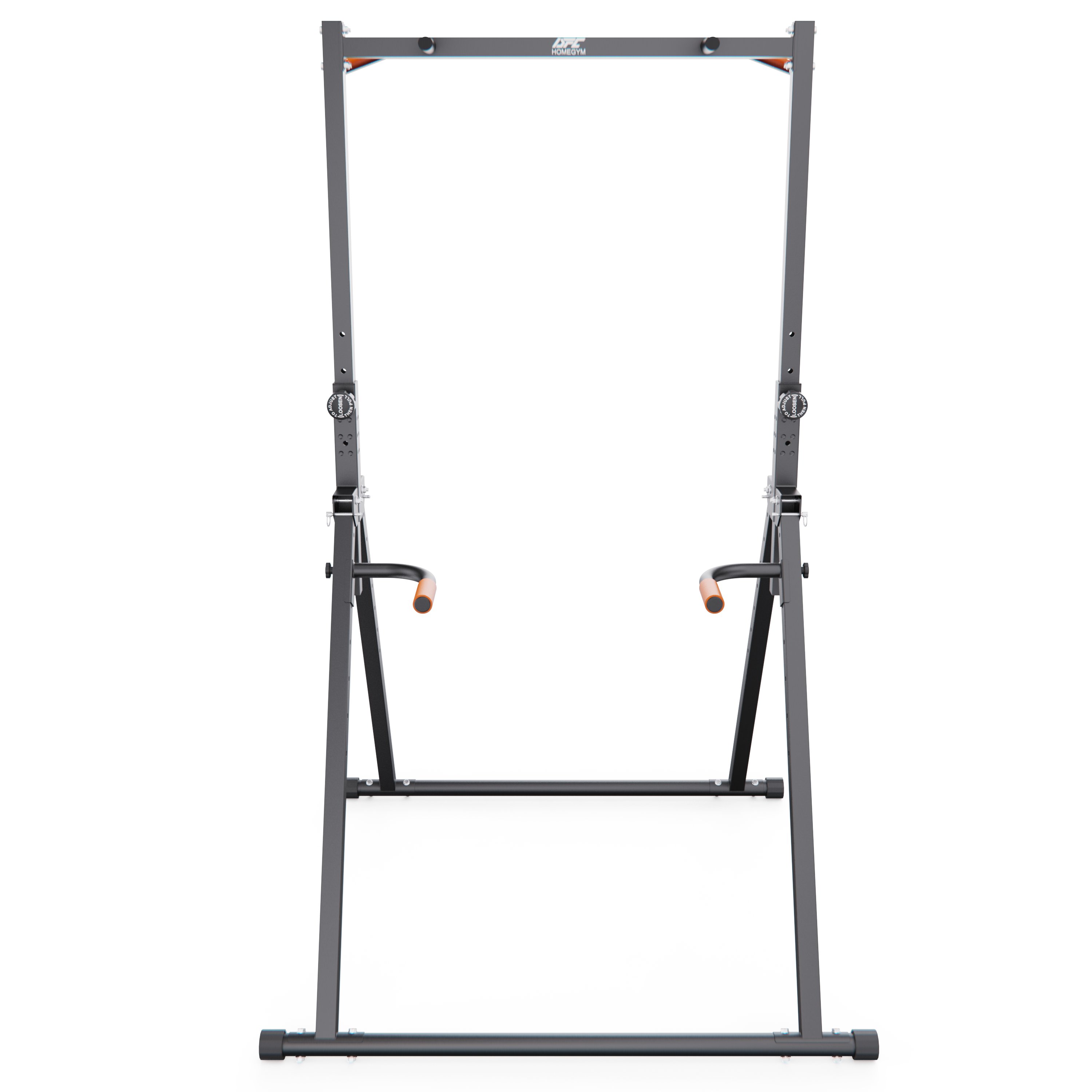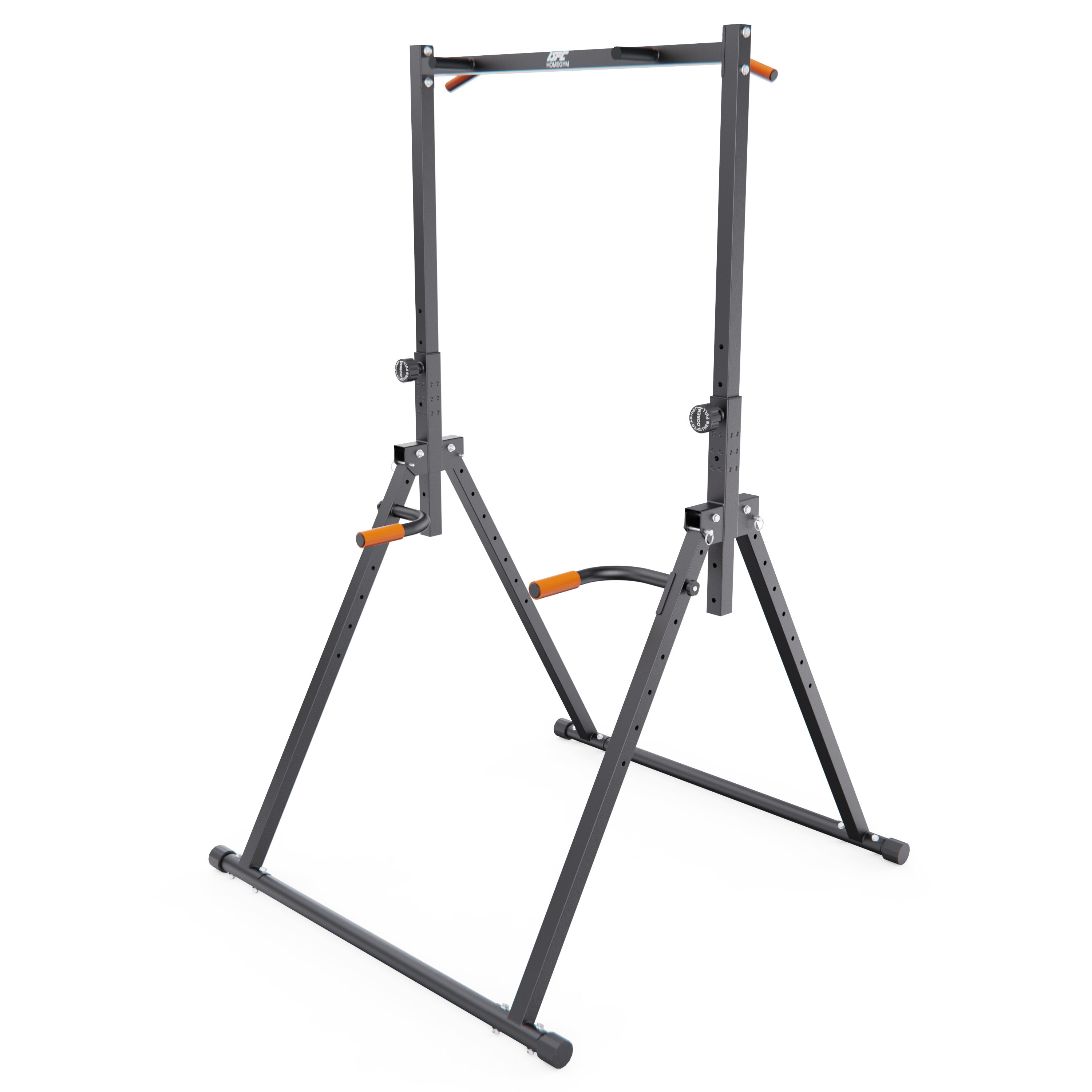 Верхняя перекладина для подтягиваний длиной 100,5 см с диаметром хвата 25 мм обеспечивает удобный и надежный захват. Нижняя поперечная перекладина длиной 63 см и диаметром 32 мм предназначена для выполнения отжиманий и других упражнений. Высота стойки регулируется по 7 уровням с общим диапазоном изменения 49 см. Нижняя часть рамы дополнительно имеет 8 уровней регулировки.