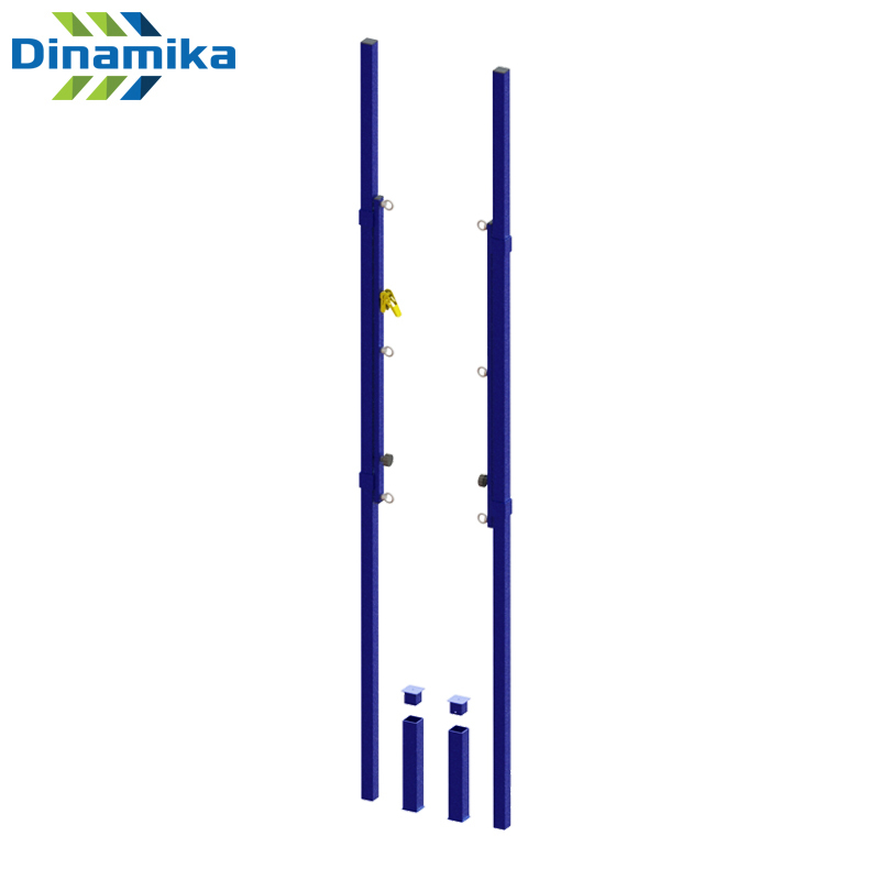 Стойки волейбольные универсальные со стаканами (с системой натяжения) - представляют собой конструкцию, состоящую из вертикальных стоек, подвижных планок (каретка) с механизмом натяжения сетки, стаканов, устанавливаемых в пол или бетонируемых на улице, крышки для стаканов. Механизм натяжения сетки - храповик внешнего крепления. В состав изделия входят крепежные элементы для фиксации подвижных планок (кареток). Сварные швы стоек тщательно обработаны и зачищены. Поверхность стоек окрашена порошковым напылением в электростатическом поле. Стаканы бетонируются в грунт. Стойки устанавливаются в стаканы.