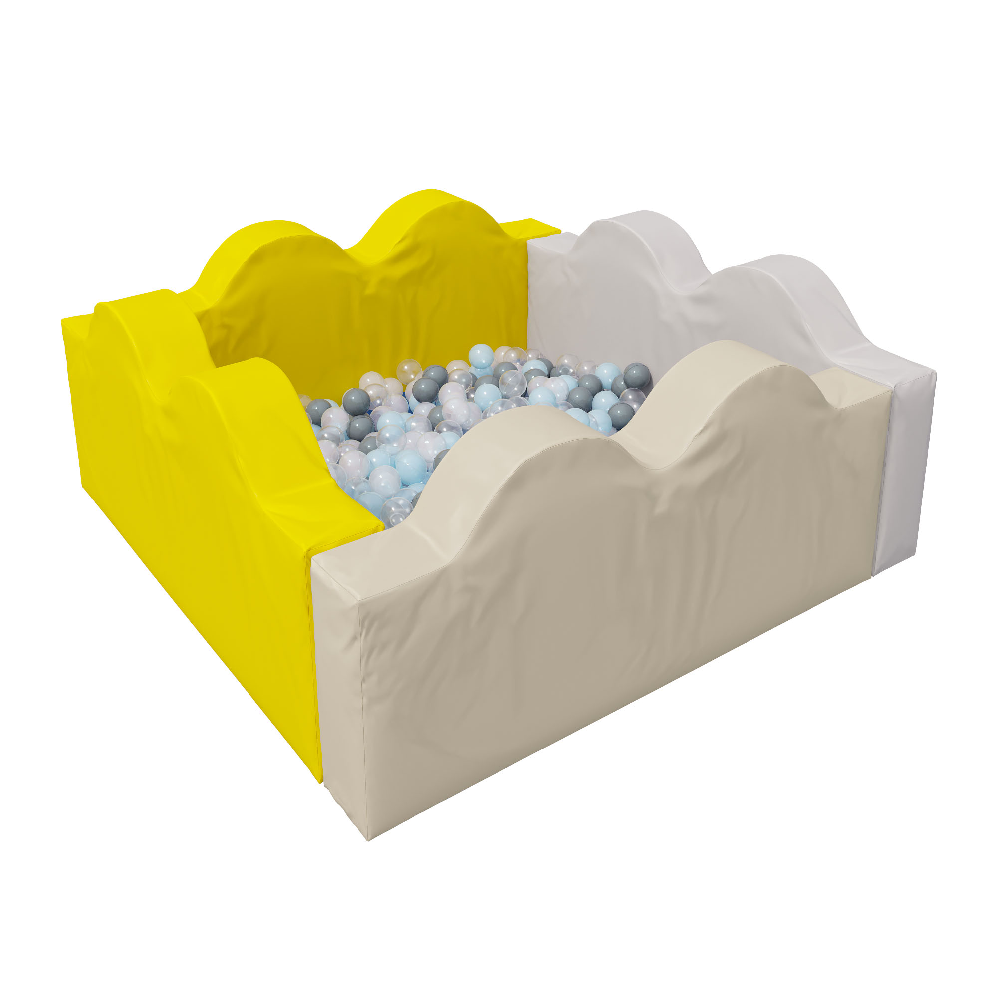 Сухой бассейн с шариками «Волна» - необычный бассейн с волнистыми бортами для детской комнаты или дачного участка. Сухой бассейн собирается из отдельных элементов, которые крепятся друг к другу с помощью липучек. Мягкие бортики в форме волн и такой же мягкий мат, выполняющий роль дна, обеспечивают малышу полный комфорт и безопасность во время игры. Дно и стенки бассейна, изготовлены из поролона и обтянуты качественной износостойкой винилискожей. Вместо воды такой резервуар заполняется пластмассовыми шариками (входят в комплектацию 300 шариков), «плавая» в которых дети развивают координацию движений, мелкую моторику и получают полезный расслабляющий массаж всего тела. Помогает малышу развивать мелкую моторику, знакомиться с цветами и объёмами предметов. Габаритные размеры 1400 х 1400 x 400 мм. Отлично моется. Вес с упаковкой 12,5 кг.