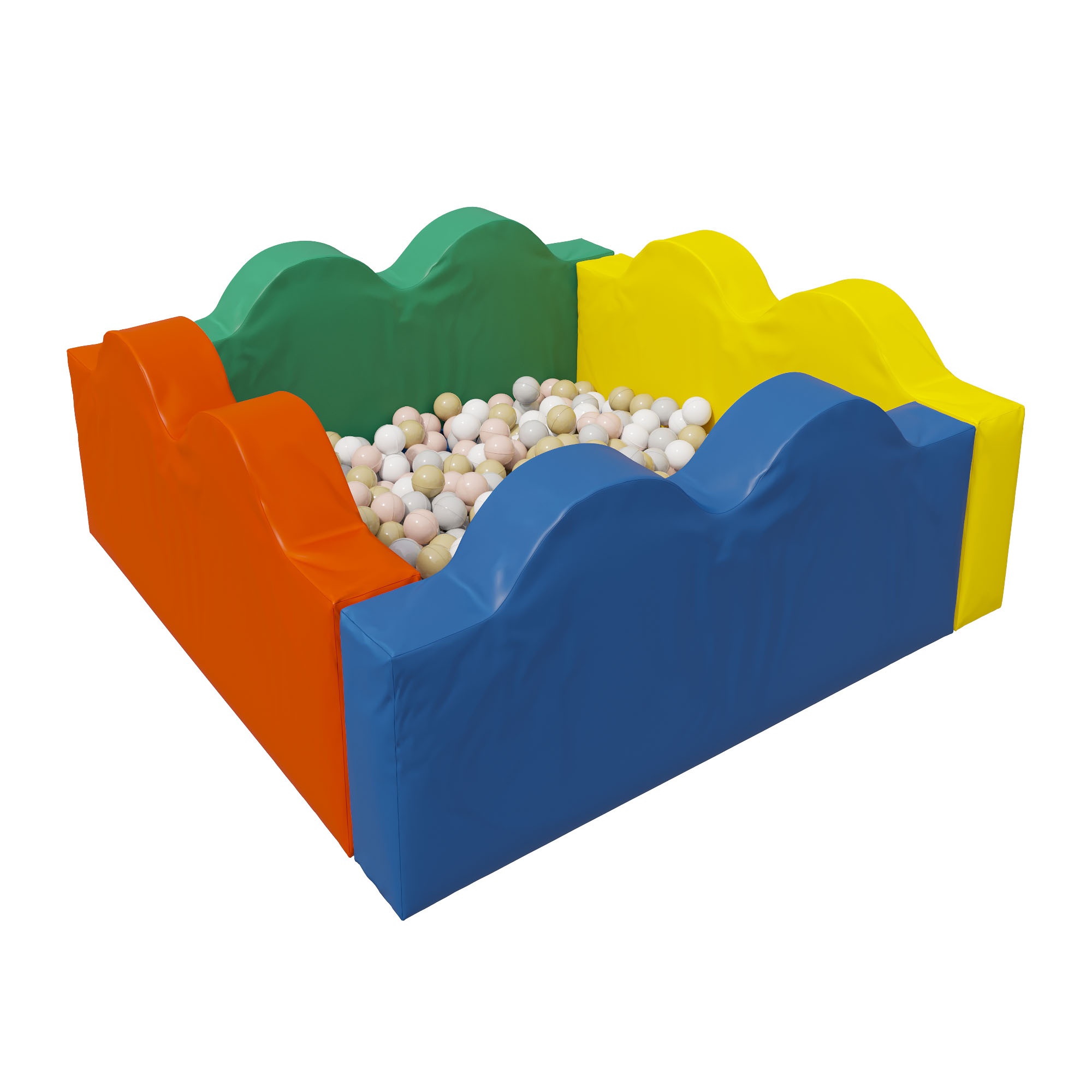Сухой бассейн с шариками «Волна» - необычный бассейн с волнистыми бортами для детской комнаты или дачного участка. Сухой бассейн собирается из отдельных элементов, которые крепятся друг к другу с помощью липучек. Мягкие бортики в форме волн и такой же мягкий мат, выполняющий роль дна, обеспечивают малышу полный комфорт и безопасность во время игры. Дно и стенки бассейна, изготовлены из поролона и обтянуты качественной износостойкой винилискожей. Вместо воды такой резервуар заполняется пластмассовыми шариками (входят в комплектацию 300 шариков), «плавая» в которых дети развивают координацию движений, мелкую моторику и получают полезный расслабляющий массаж всего тела. Помогает малышу развивать мелкую моторику, знакомиться с цветами и объёмами предметов. Габаритные размеры 1400 х 1400 x 400 мм. Отлично моется. Вес с упаковкой 12,5 кг.