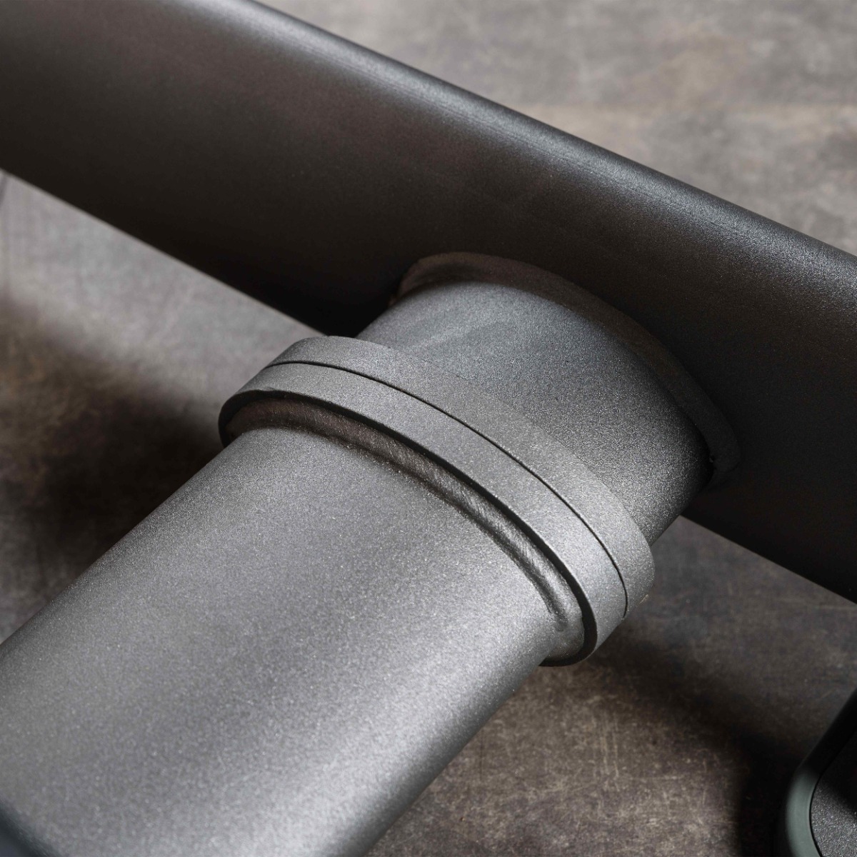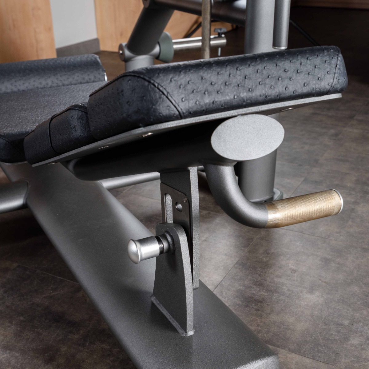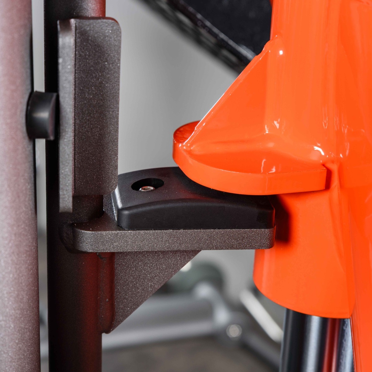 Опорные элементы тренажёра оснащены подпятниками сложной геометрии из износостойкой резины толщиной 20 мм с металлическим основанием и отверстии для возможности фиксации тренажера к полу. Такая конструкция гарантирует устойчивость оборудования, равномерное распределение нагрузки и защиту напольного покрытия от повреждений.