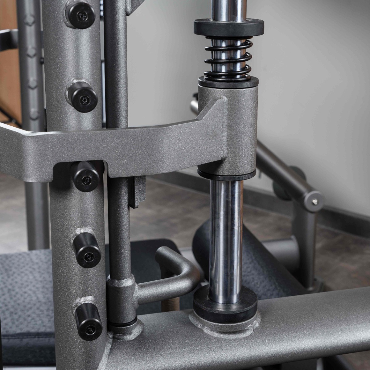 С обеих сторон тренажёра расположено по пять страховочных упоров, фиксирующих платформу на нужной высоте в случае снятия основных ограничителей движения (фиксаторов) платформы.