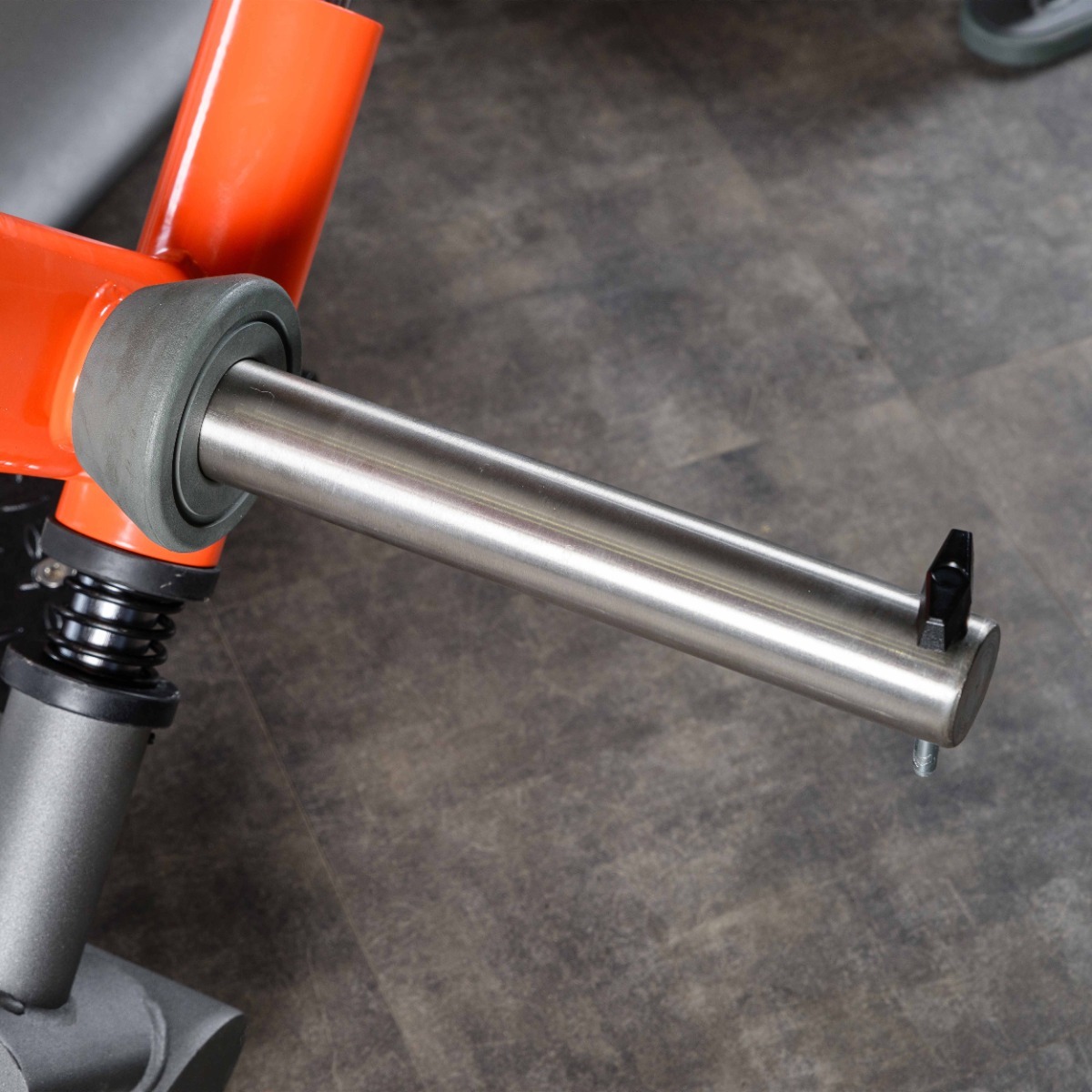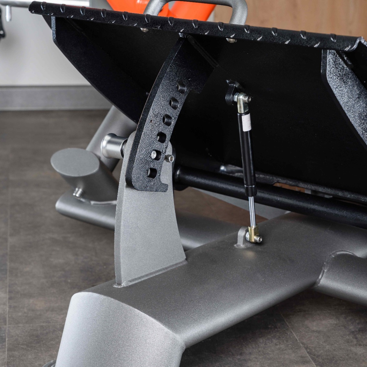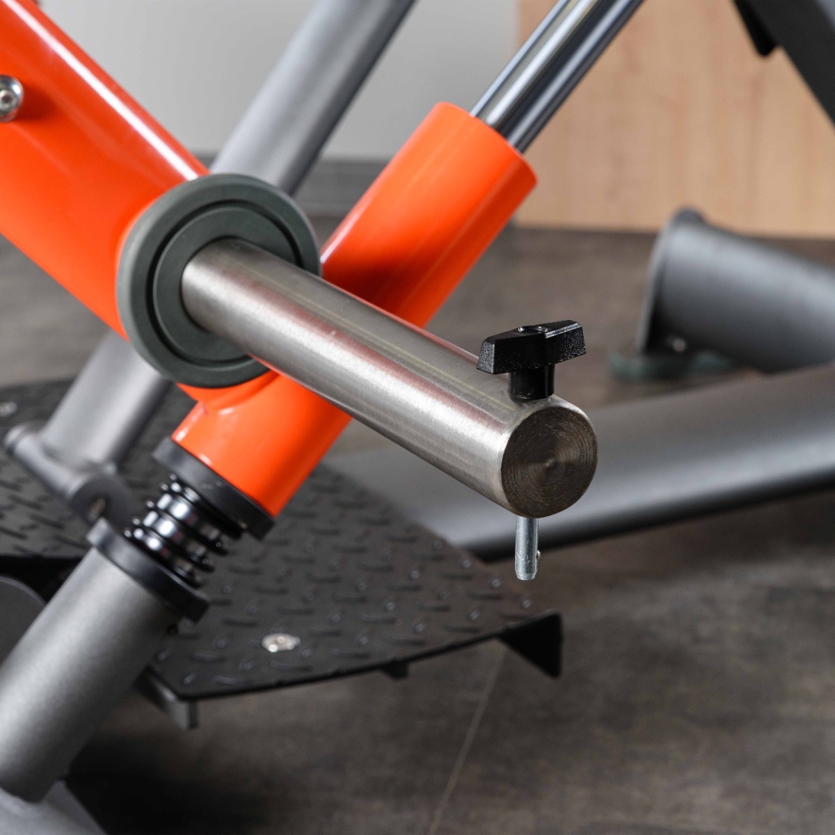 Опорные элементы тренажёра оснащены подпятниками сложной геометрии из износостойкой резины толщиной 20 мм с металлическим основанием и отверстии для возможности фиксации тренажера к полу. Такая конструкция гарантирует устойчивость оборудования, равномерное распределение нагрузки и защиту напольного покрытия от повреждений.