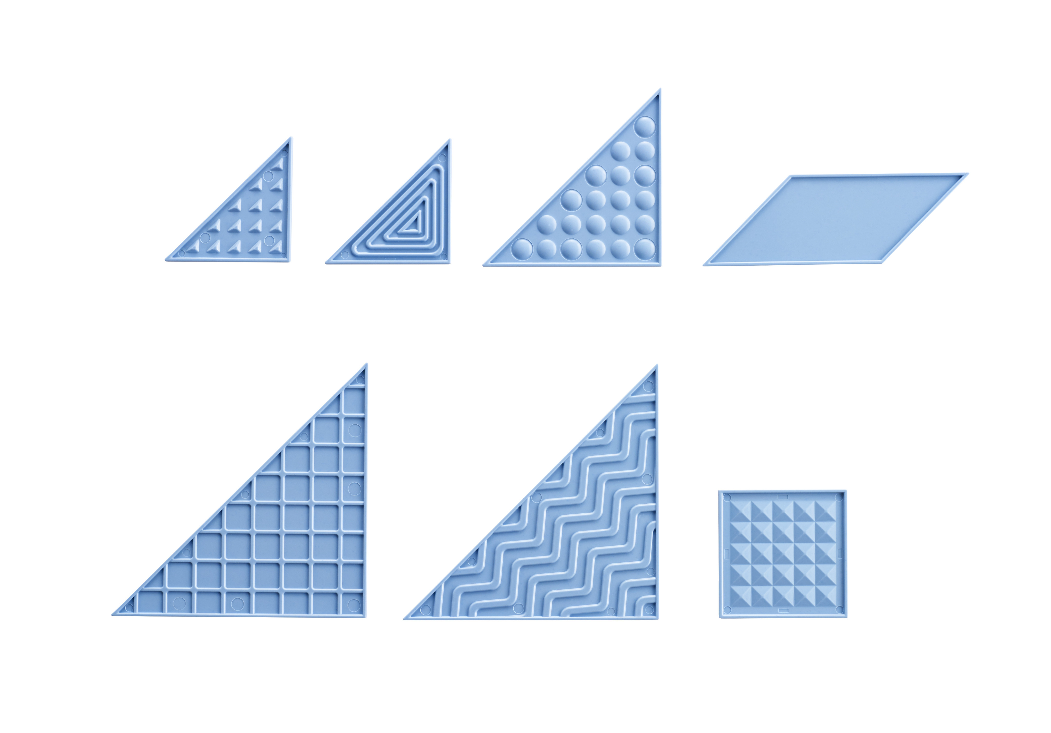 В комплект входят: 7 тактильных фигур (нежно-голубого цвета), различных тактильных поверхностей и 15 карточек с заданиями.
