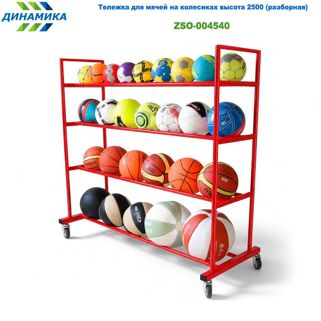 Мобильная тележка для мячей предназначена для использования в спортивном зале. Служит одновременно стеллажом и тележкой для хранения мячей, при необходимости позволяет подвозить их до нужной точки зала.