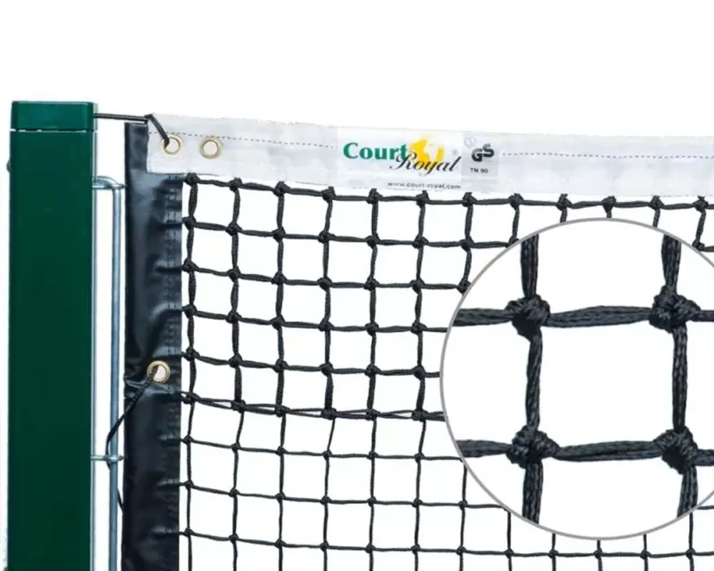 Теннисная сетка изготовлена из полиэтиленового материала, сплетенного вручную в 4 шва. Верхние 6 рядов выполнены в двойной оплетке для большей прочности. Размер каждой ячейки 4 см, что предотвращает застревание мячей.