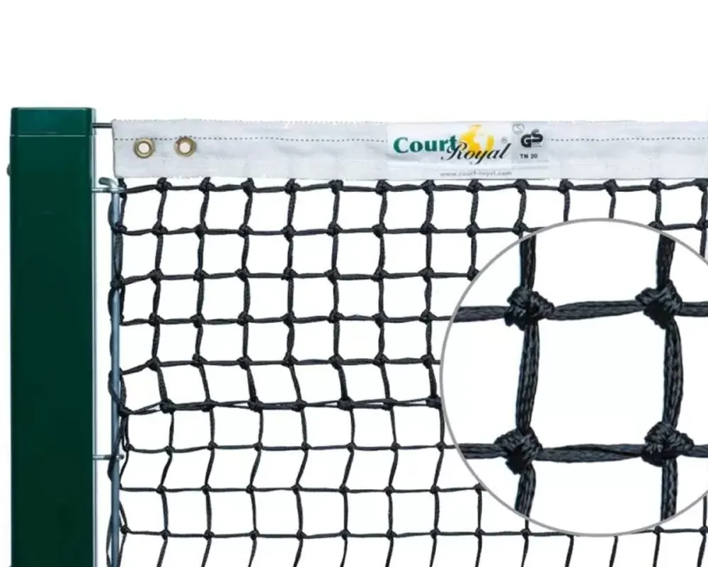 Теннисная сетка изготовлена из полиэтиленового материала, сплетенного вручную в 4 шва. Верхние 6 рядов выполнены в двойной оплетке для большей прочности. Размер каждой ячейки 4 см, что предотвращает застревание мячей.
