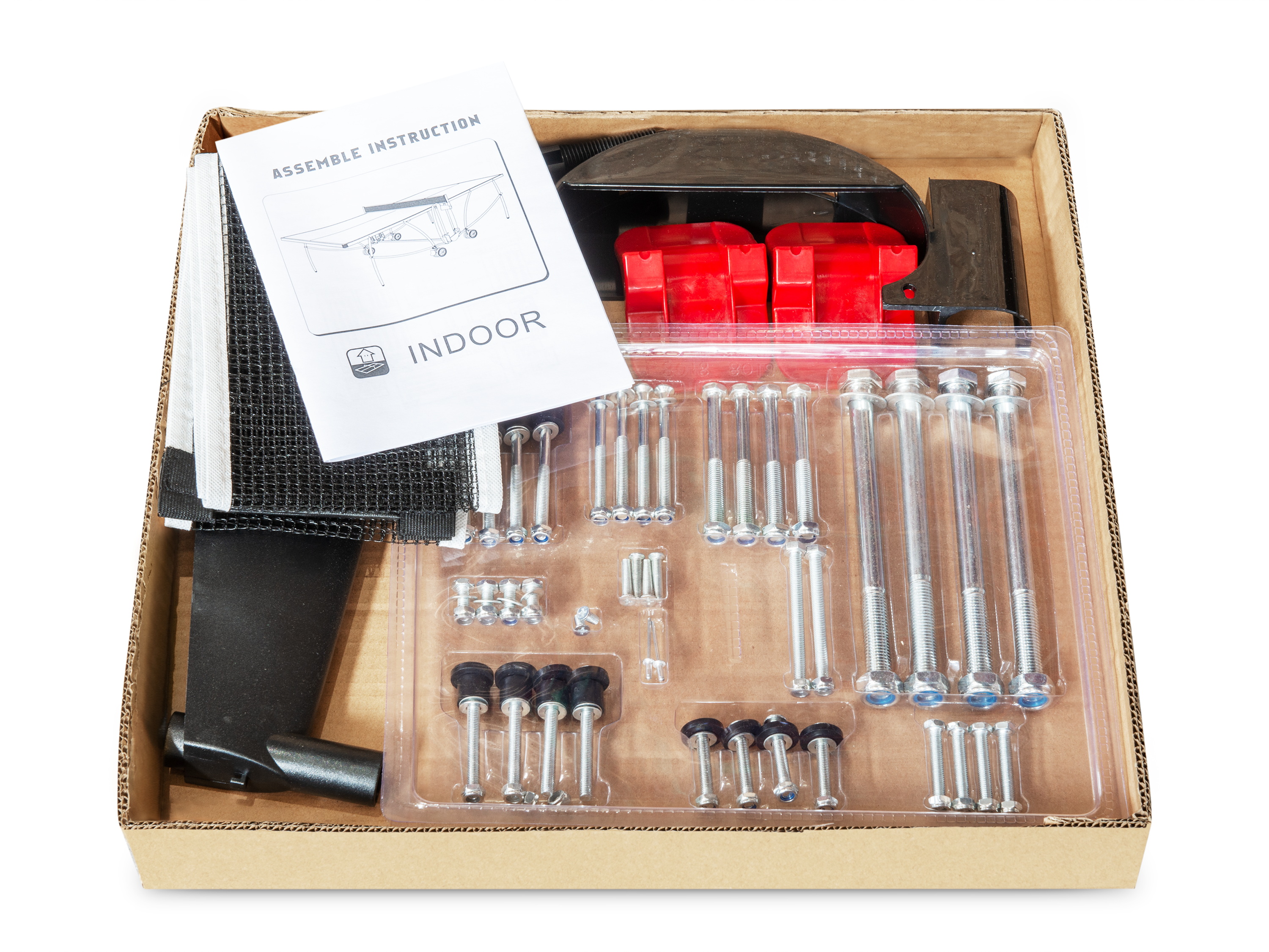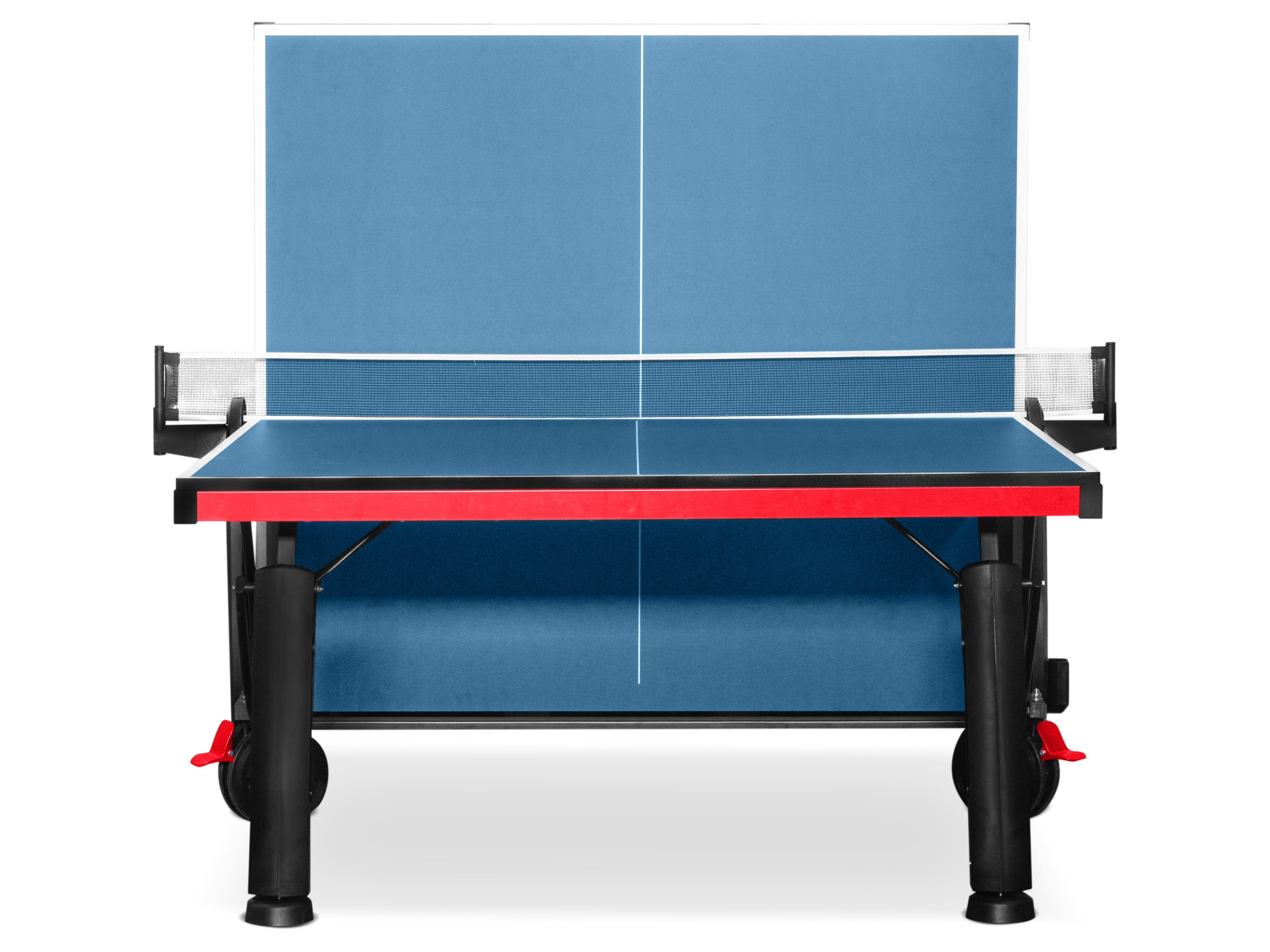 Органайзеры для ракеток и мячей закреплены на боковых панелях из черного пластика. На каждой стороне стола можно разместить по две ракетки и три мяча.