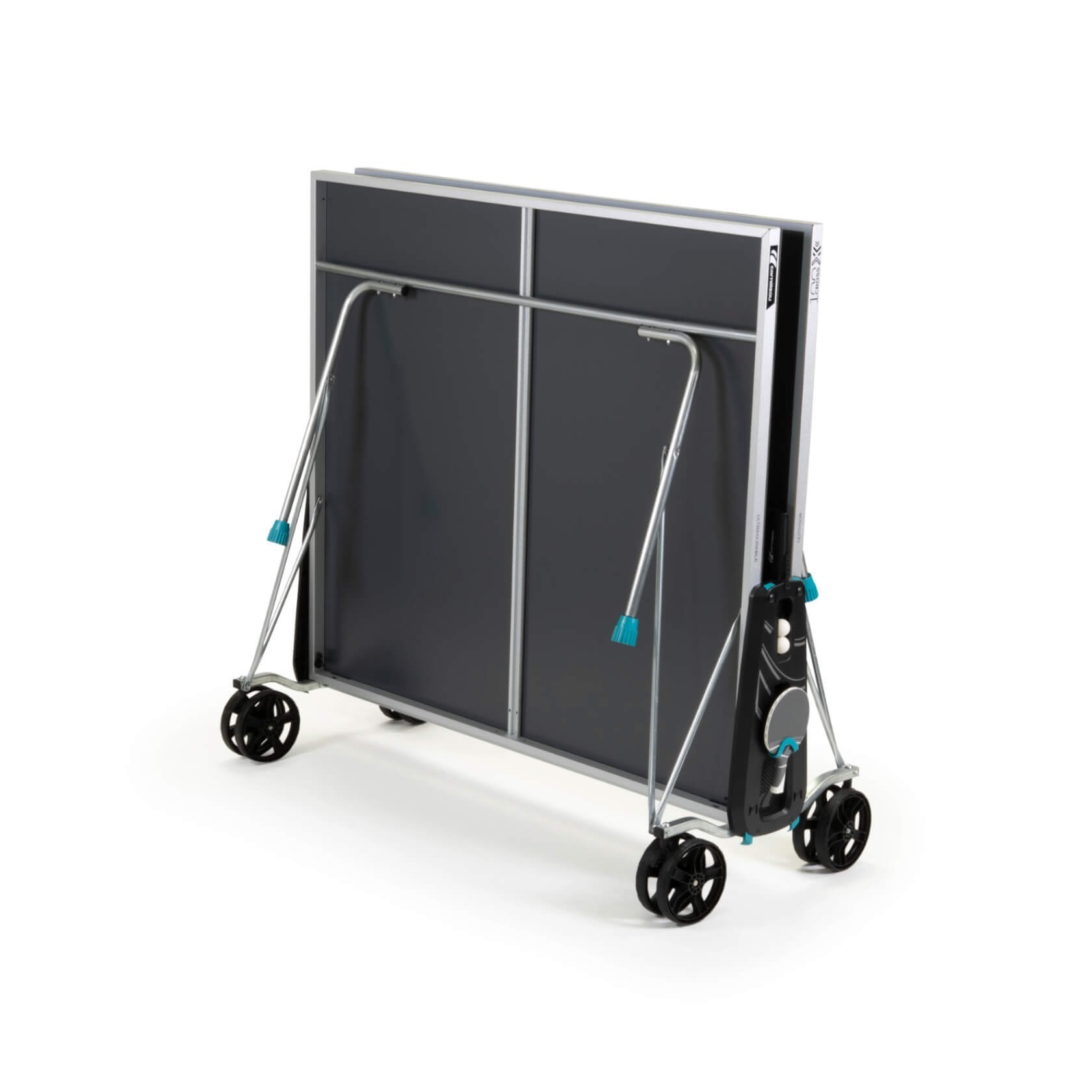 Тормозные механизмы для двух пар транспортировочных колес позволят надежно зафиксировать теннисный стол в рабочем и сложенном положении, снижая риск несанкционированного перемещения и сохраняя точные настройки рабочей позиции столешниц в горизонтальной плоскости (юстировка) в случае физических контактов игрока со столом, которые неизбежны во время увлекательного матча.