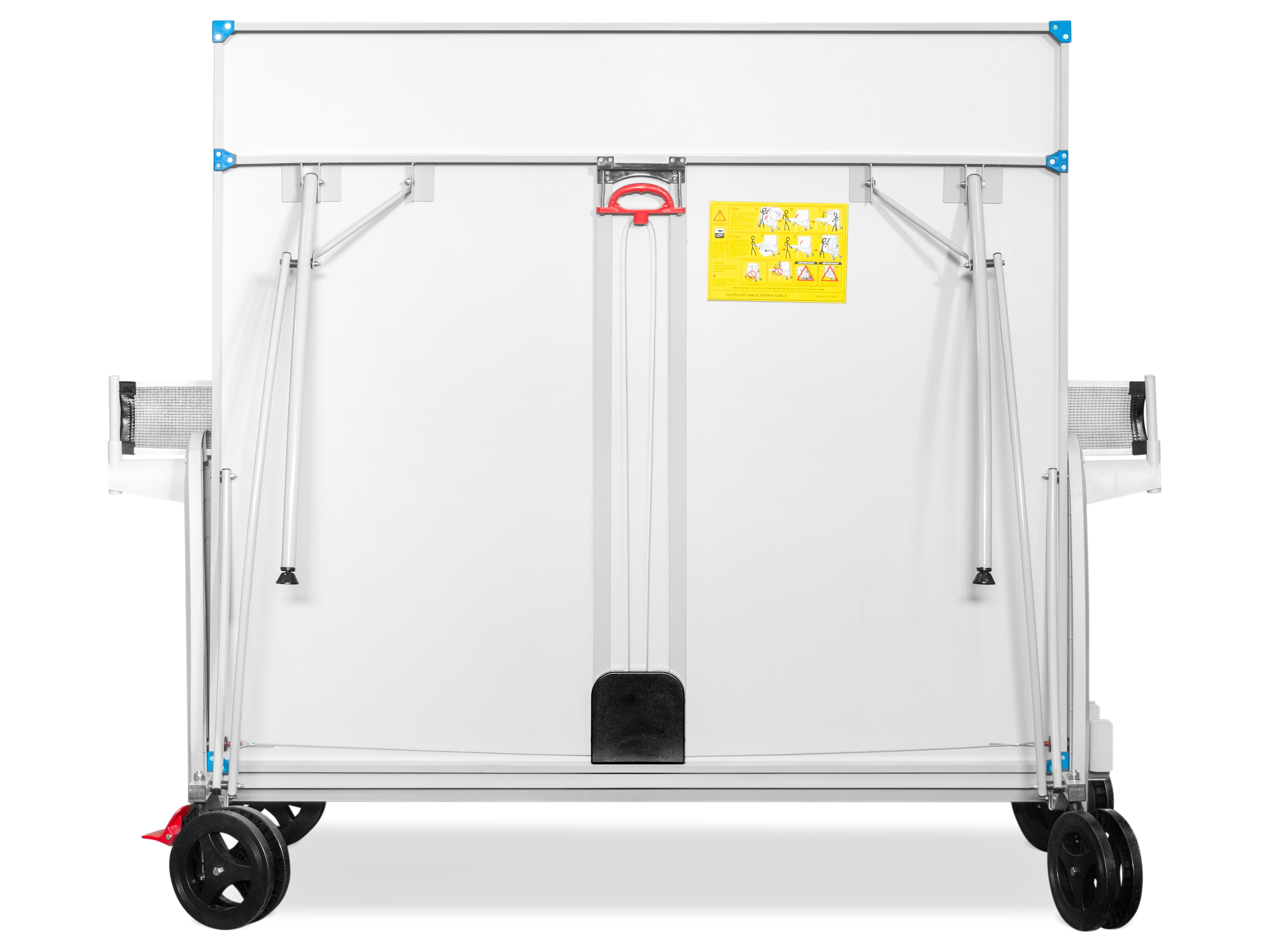 Маневренность при перемещении. Четыре сдвоенных обрезиненных колеса с диаметром 200 мм легко поворачиваются в нужном направлении. Они обеспечивают маневренность и позволяют с лёгкостью перемещать стол в сложенном или разложенном виде.