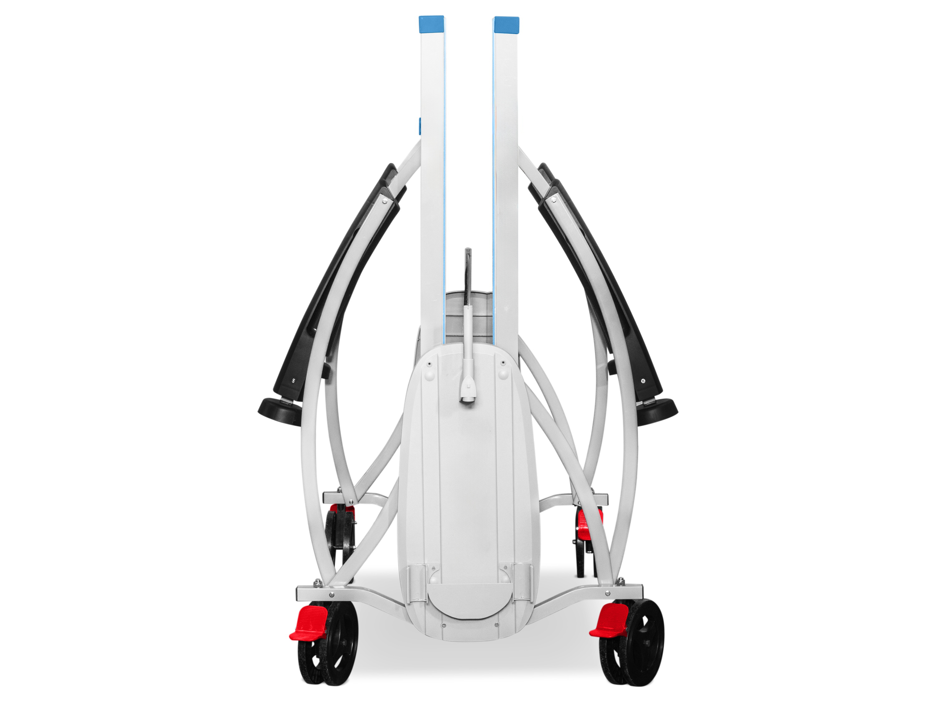 Четыре сдвоенных обрезиненных колеса с диаметром 200 мм обеспечивают маневренность и позволяют с лёгкостью перемещать стол в сложенном или разложенном виде.