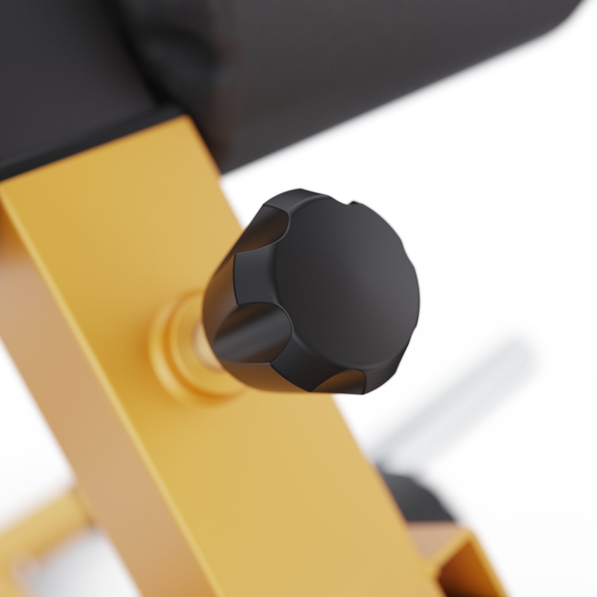 Сиденье размером 32 х 26 см регулируется по высоте в 5 положениях, что позволяет подстроить тренажер под индивидуальные особенности спортсмена. Для фиксации ног предусмотрены удобные валики длиной 21 см и диаметром 11 см, также с 5 уровнями регулировки. Валики изготовлены из плотной пены и покрыты износостойким полиуретаном, что обеспечивает комфорт и долговечность.