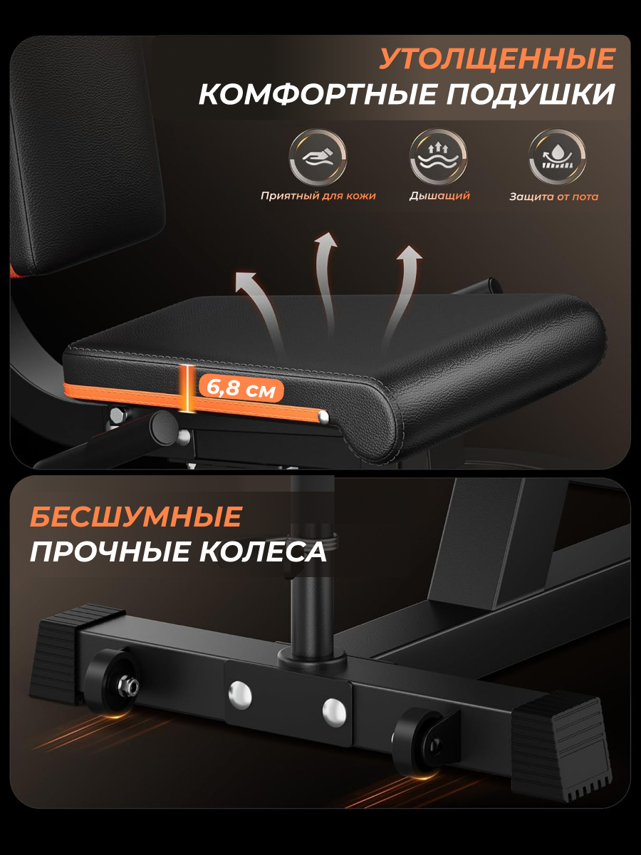 Тренажёр оснащён прочной рамой и качественной обивкой, что гарантирует долговечность и комфорт даже при регулярных занятиях. Эргономичный дизайн обеспечивает правильное положение тела во время упражнений, снижая нагрузку на суставы и спину, а плавная регулировка всех элементов позволяет адаптировать тренажёр под индивидуальные потребности каждого пользователя.
