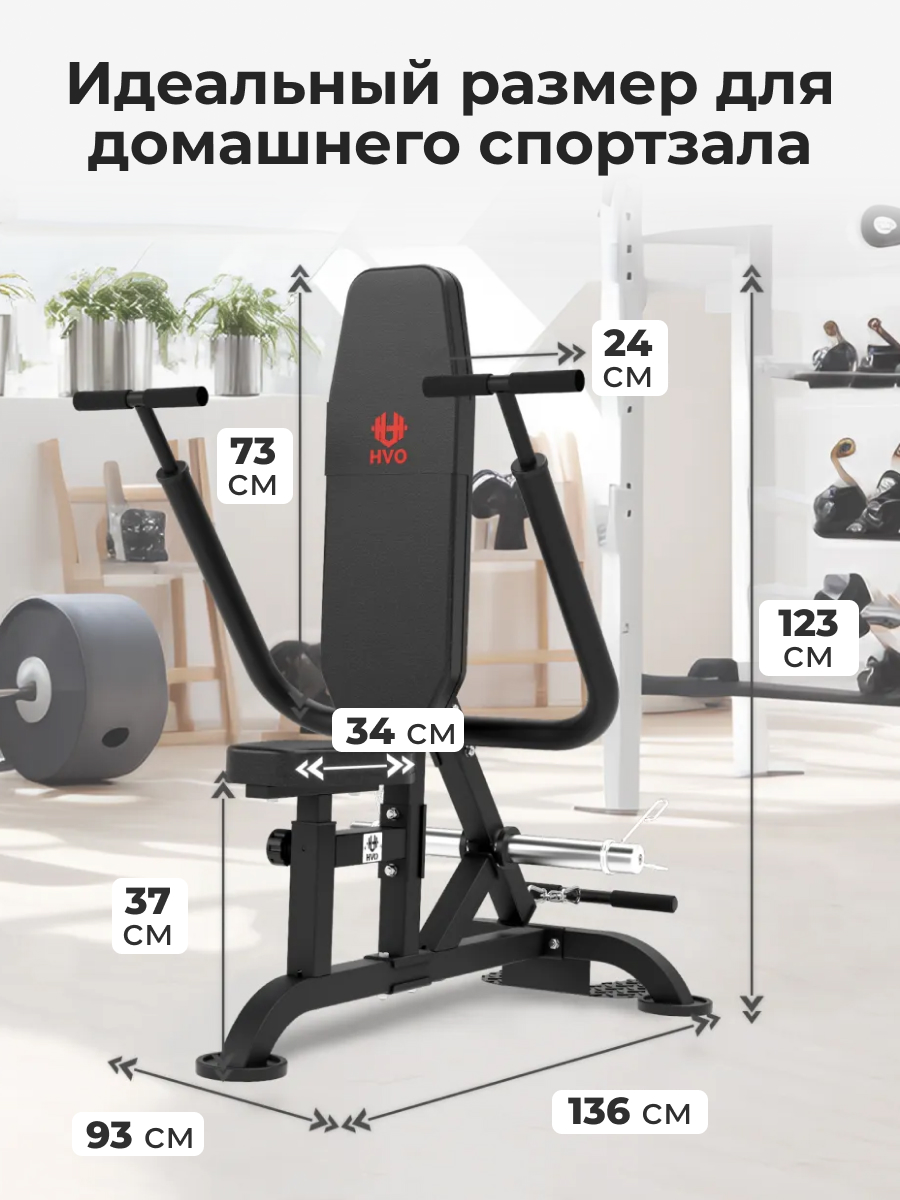 Модель рассчитана на максимальный вес пользователя 130 кг. Конструкция включает прочные трубки, крепёжные элементы и удобные подушки для комфортной тренировки. Посадочные диаметры делают устройство универсальным. Тренажёр отличается компактными размерами, удобен в установке и не требует много места.