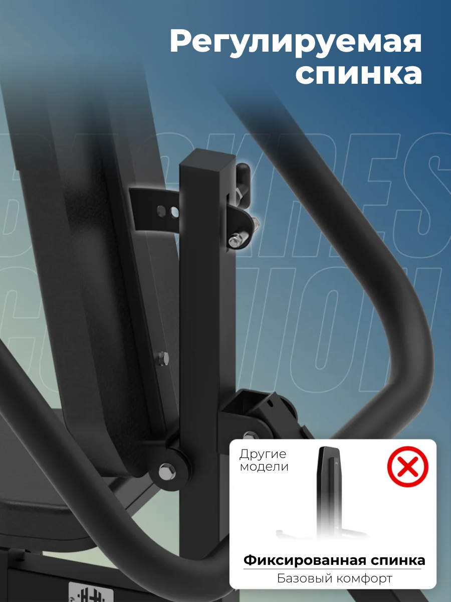 Материалы конструкции также направлены на обеспечение комфорта и долговечности. Сиденье и спинка выполнены из ПВХ, регенерированного хлопка и древесной основы, что делает их упругими, износостойкими и приятными при контакте, а рифлёная металлическая поверхность с противоскользящим покрытием обеспечивает надёжную фиксацию стоп во время тренировки.