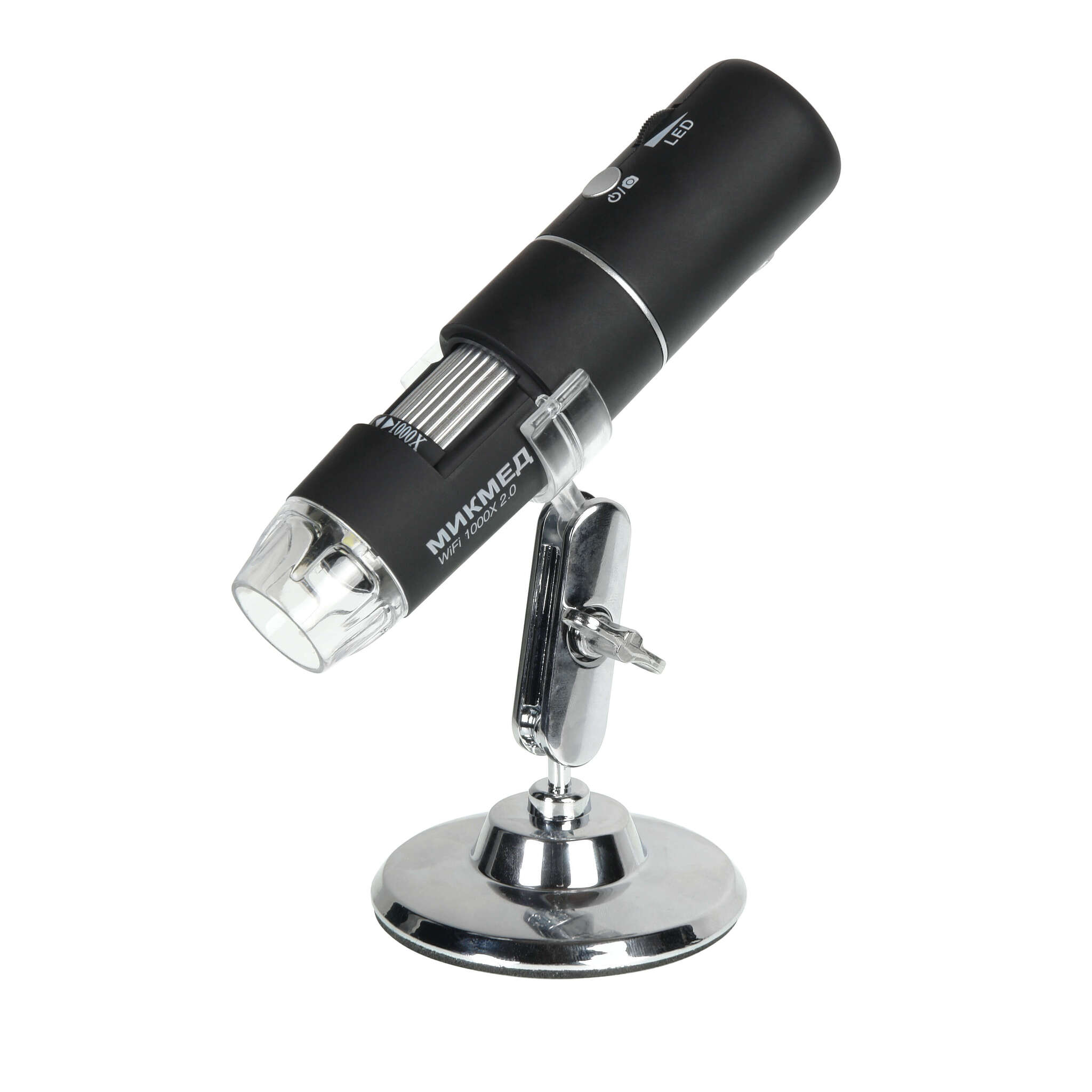 Всем пользователям РС и приложений для мобильных устройств освоить работу с микроскопом МИКМЕД WiFi 1000Х 2.0 не составит никакого труда. Микроскоп может быть установлен на настольную подставку с поворотным шарниром для стационарной работы. Шарнир позволяет зафиксировать микроскоп под любым нужным углом, что делает его удобным настольным устройством. С равным успехом микроскоп можно использовать и без подставки в качестве мобильного решения.