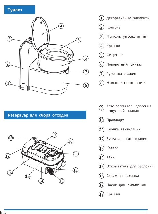 Тележка и колеса под шасси используются для транспортировки мусорных баков на места очистки. Глянцевая верхняя крышка из ПБТ и уплотнительное кольцо используются для уплотнения между баком для сточных вод и горшком. Герметичность хорошая, что может эффективно блокировать запах бака для сточных вод.