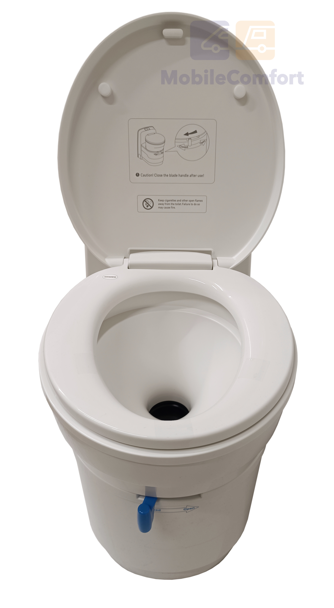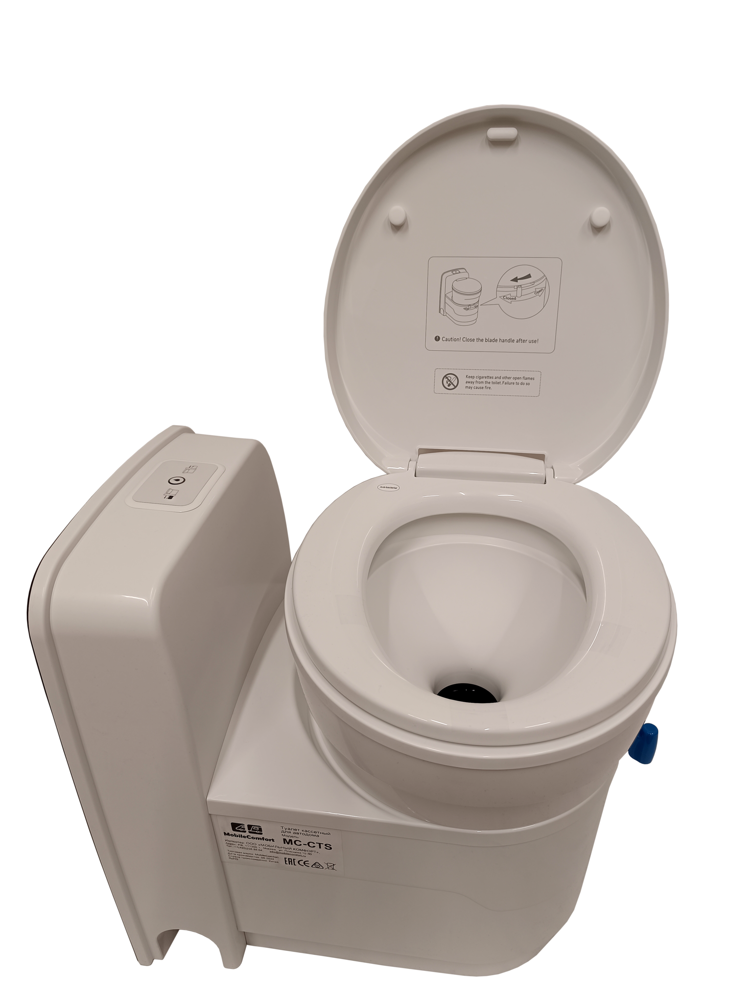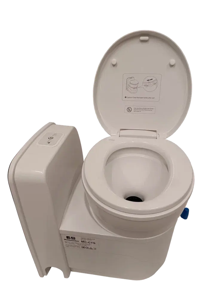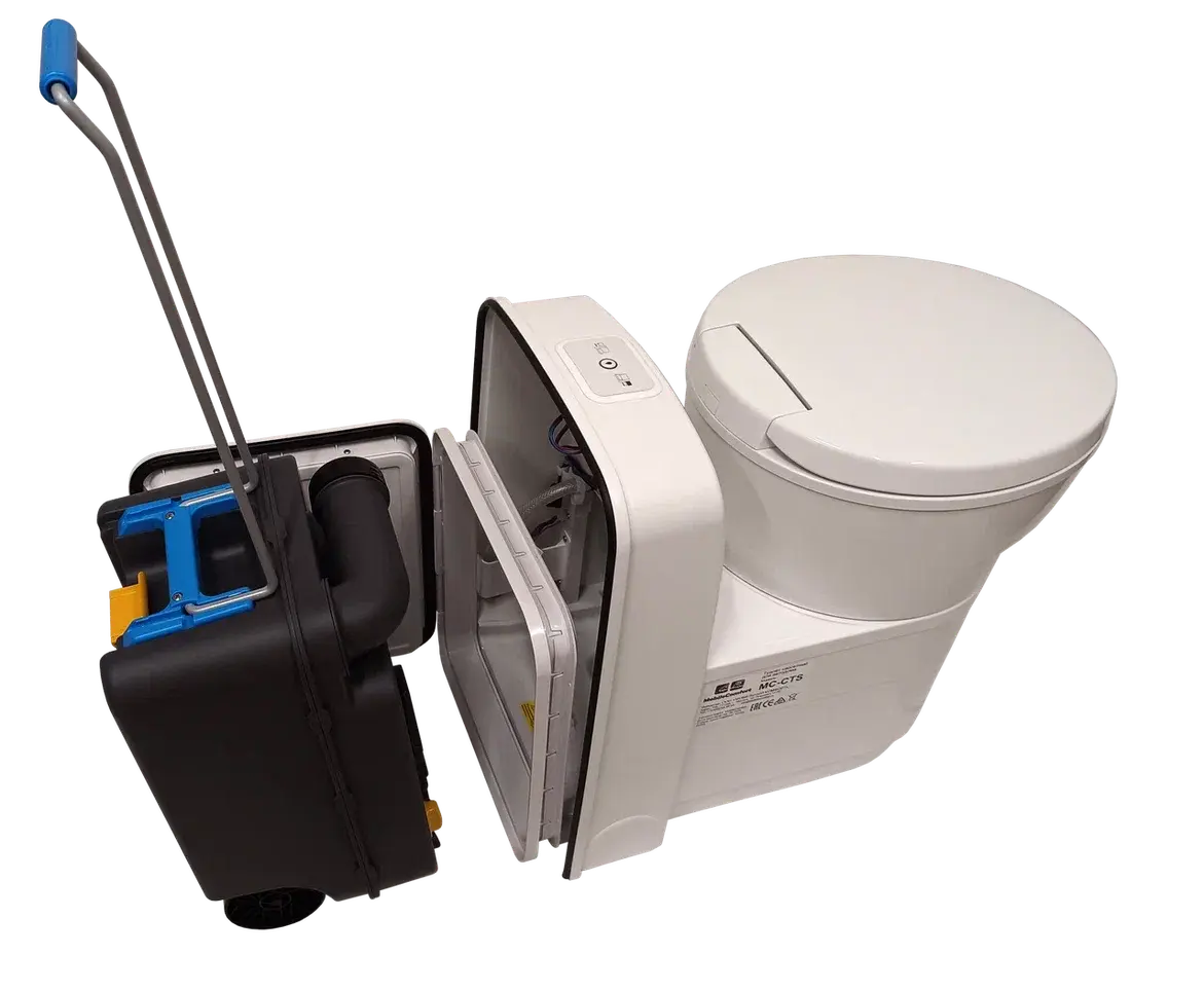 Смывной унитаз MobileComfort MC-CTS не подключен к центральной канализационной трубе. Этот унитаз имеет встроенное устройство для сбора сточных вод. Когда он наполняется, красный уровень жидкости на панели управления подсказывает, что необходимо опорожнить резервуар для сточных вод. Также есть сигнал тревоги, предупреждающий об отходах, задержка закрытия смыва для предотвращения полного переполнения коробки.