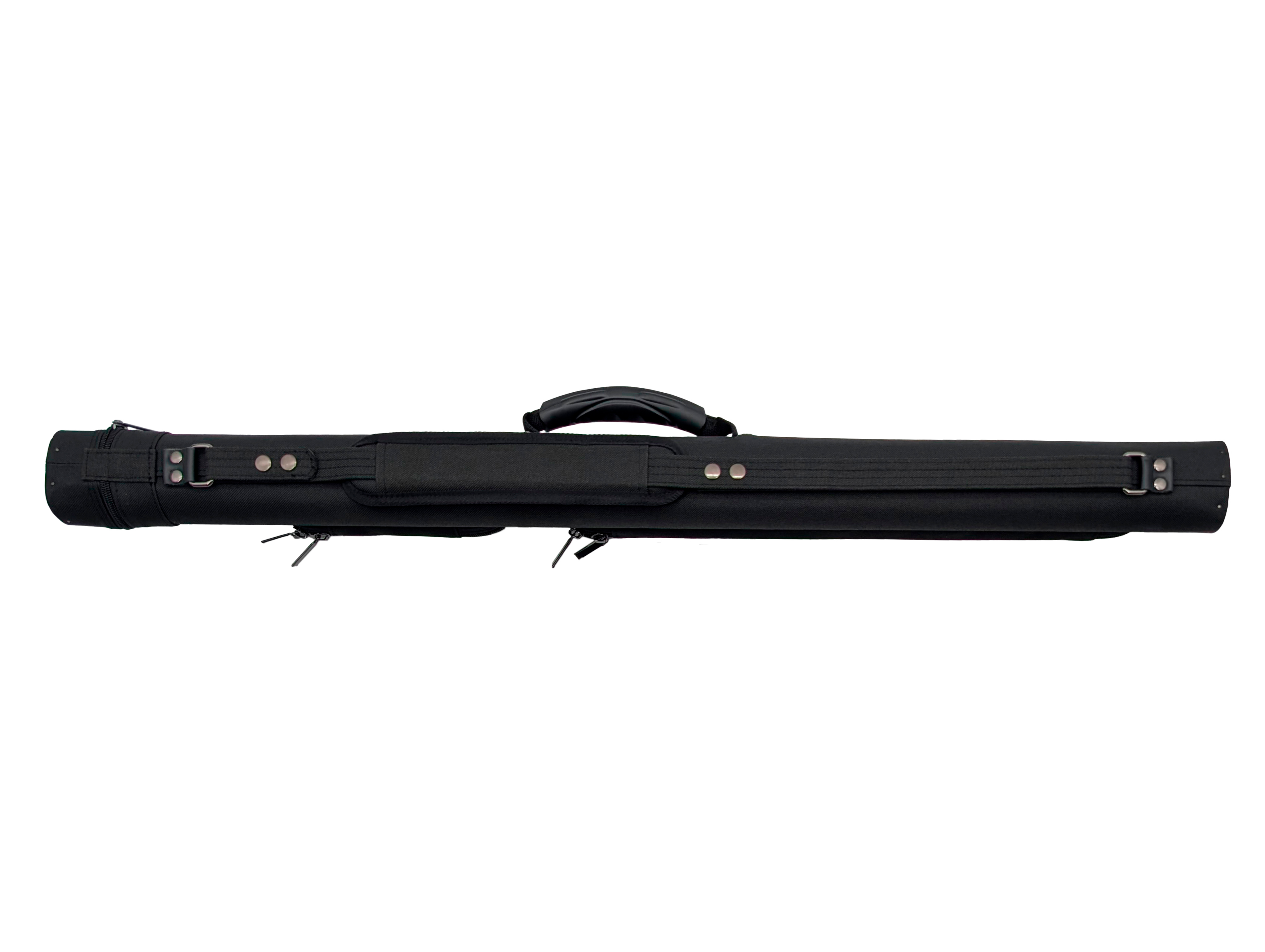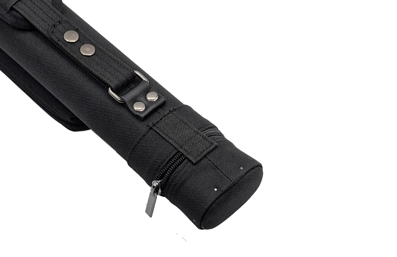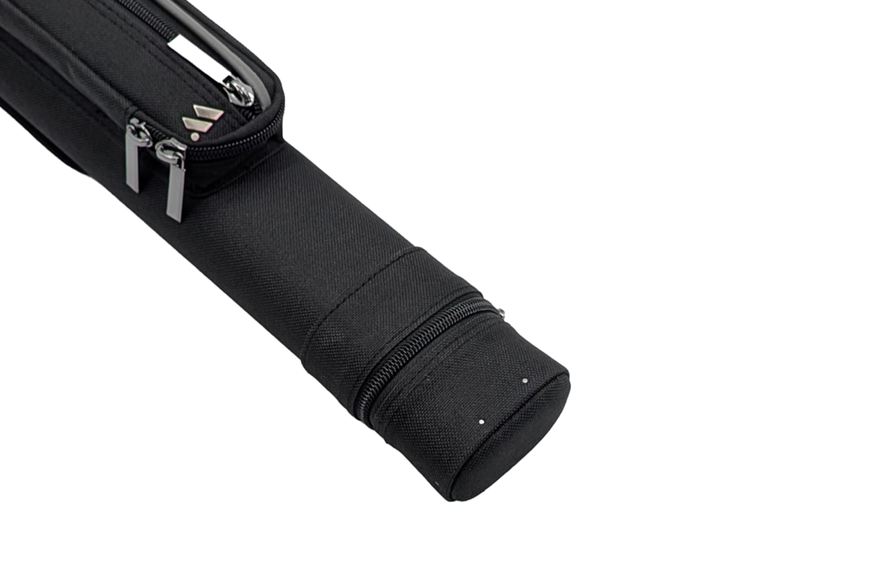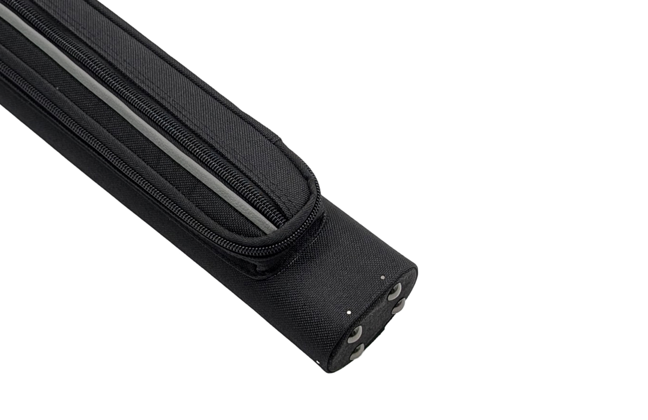 Есть ручка сбоку и наплечный ремень с регулировкой длины. На ремне есть специальная вставка для комфортной носки на плече. Каждая часть кия хранится в отдельном отсеке. С внешней стороны имеются карманы для аксессуаров и удлинителя.