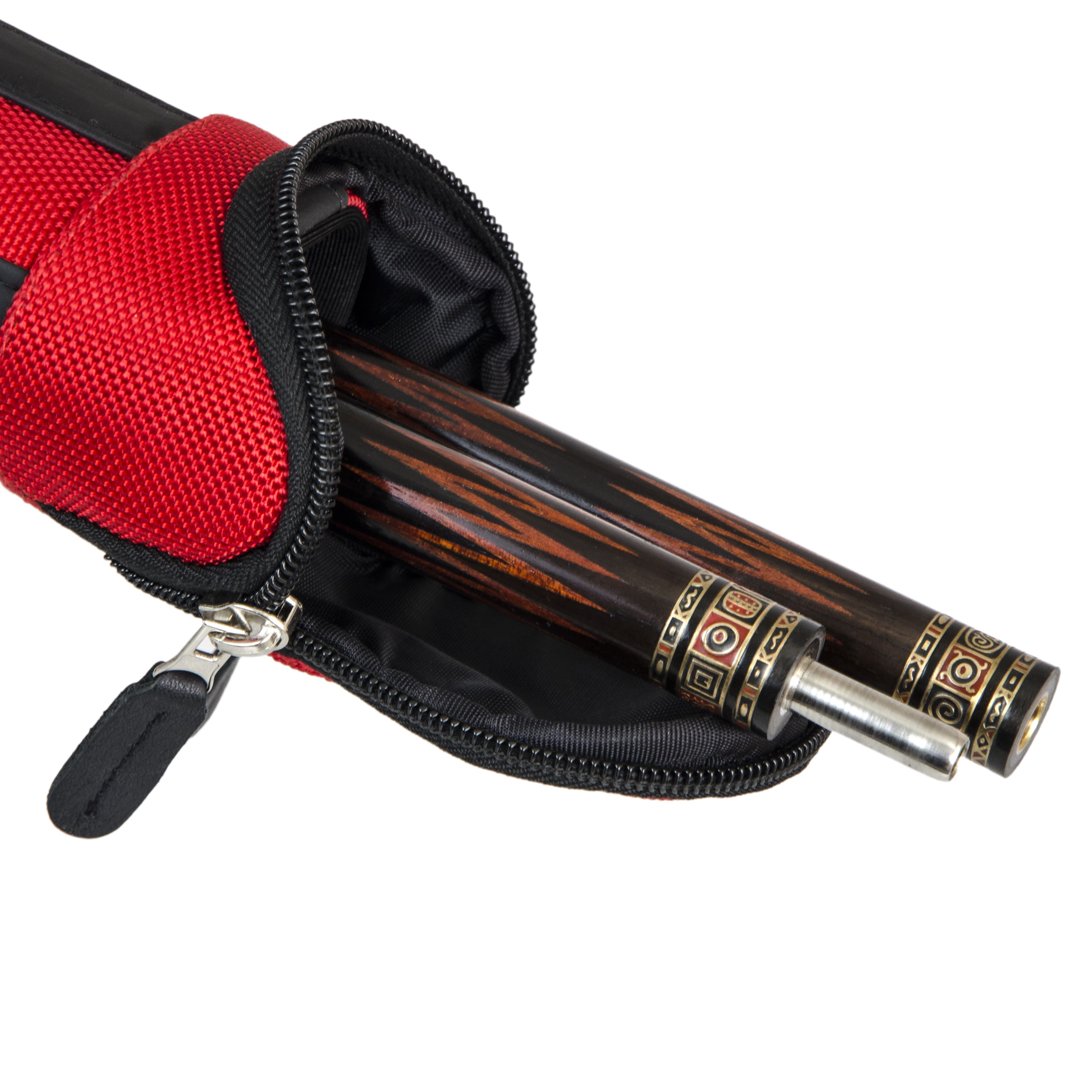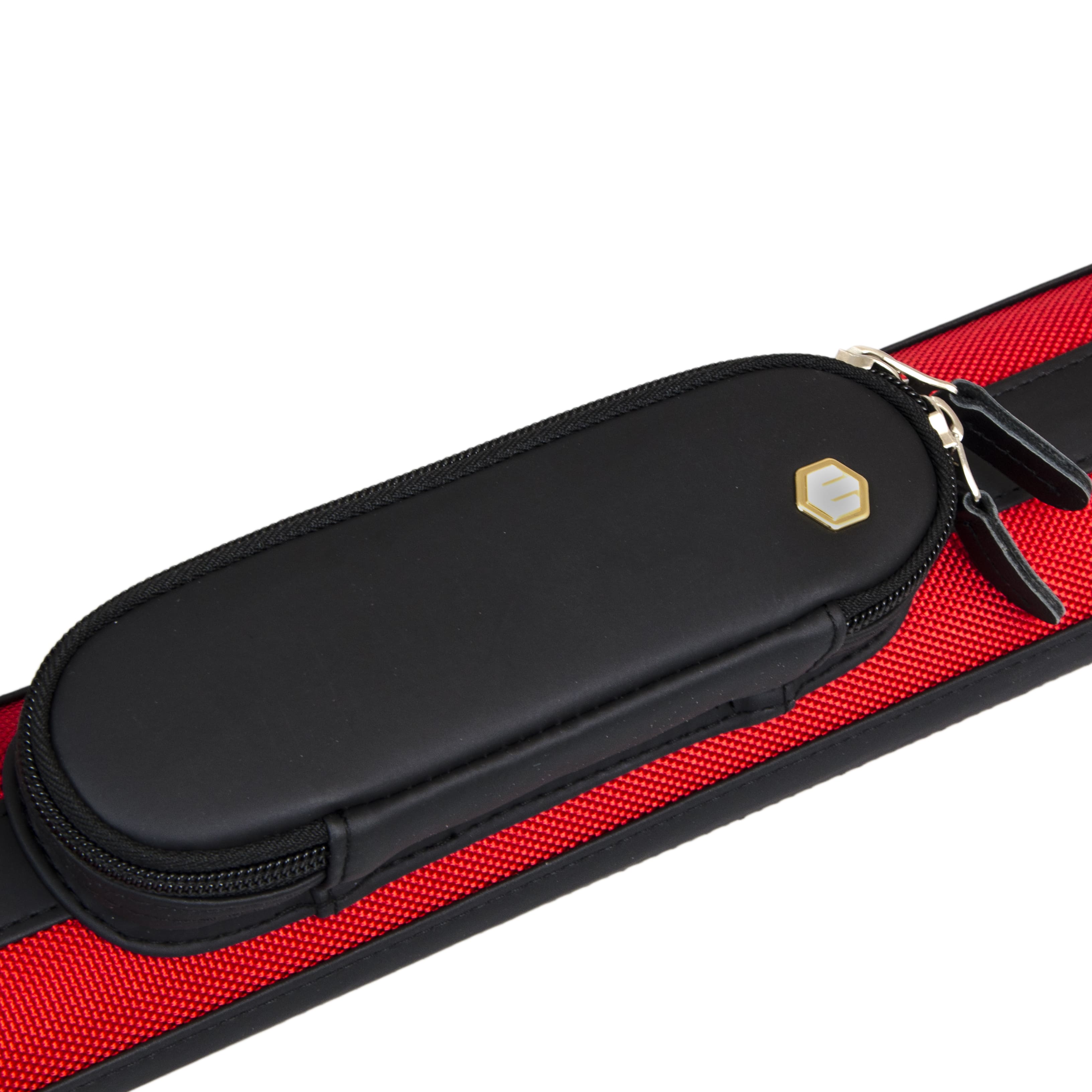 Есть ручка сбоку и наплечный ремень с регулировкой длины. На ремне есть специальная вставка для комфортной носки на плече. Каждая часть кия хранится в отдельном отсеке. С внешней стороны имеются карманы для аксессуаров и удлинителя. Большой карман внутри снабжен дополнительной молнией для надежной фиксации.