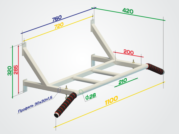 Порошковое напыление делает турник стойким к воздействиям внешних сред и эстетичным (цвет - по согласованию: белый, серый, черный)