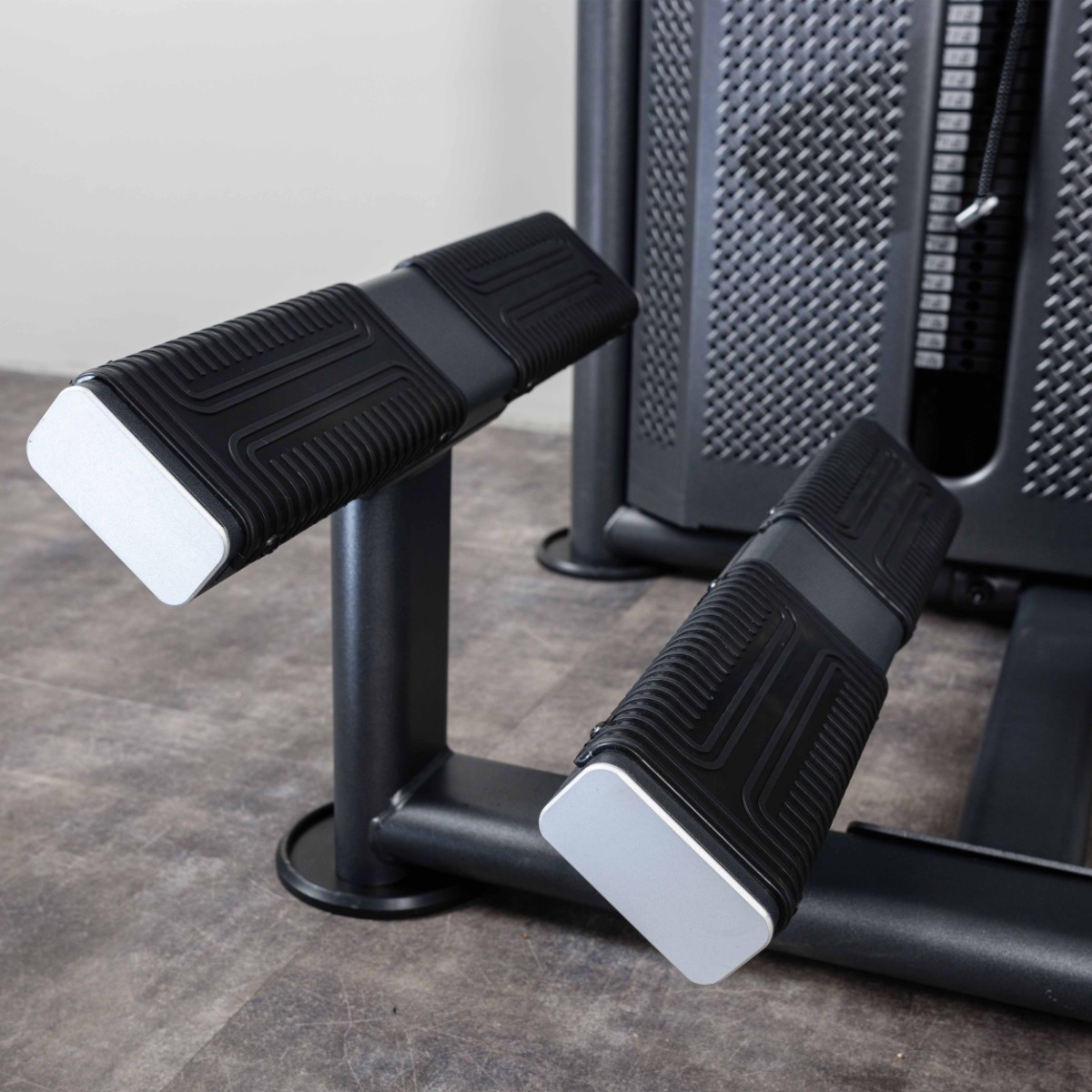 Металлическая перфорированная защита весового стека с лицевой стороны и сплошная защита с задней стороны выполнена из листового металла толщиной 2 мм. Ребра жесткости у основания, примыкающие к несущей раме через скрытое болтовое соединение сечением 6 мм в восьми точках, повышают эксплуатационные параметры тренажера.