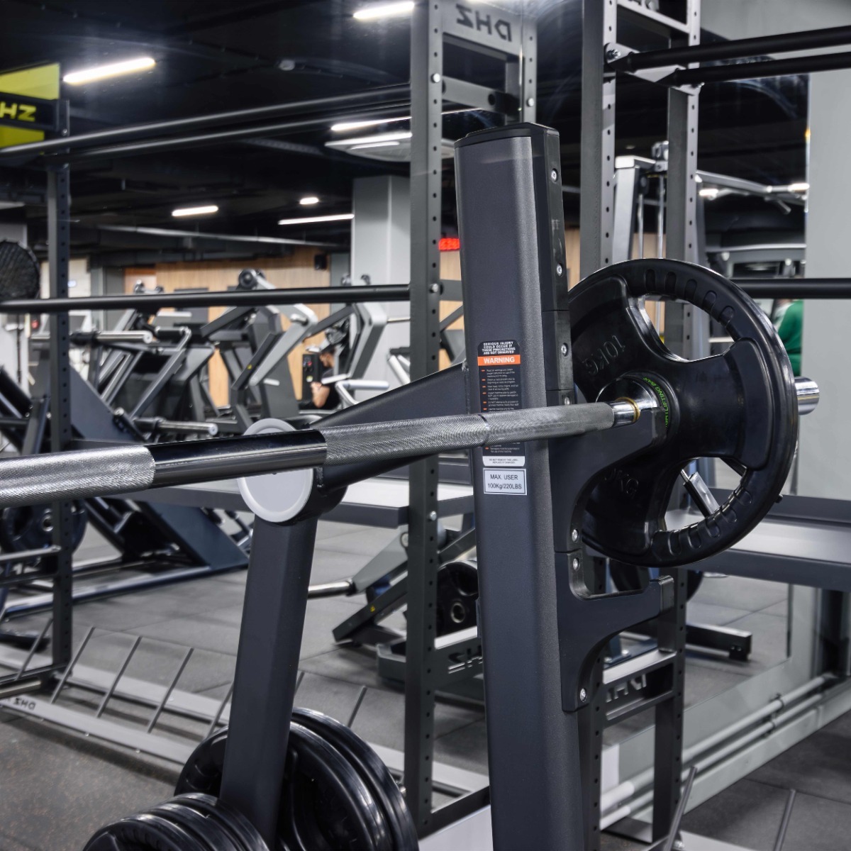 На раме закреплены четыре металлических накопителя для хранения свободных весов, оборудованные кольцами из плотной резины для предотвращения механических повреждений при соприкосновении дисков с рамой.